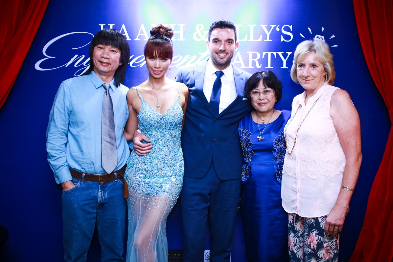 | Dù thoải mái chia sẻ chuyện tình cảm với bạn trai ngoại quốc nhưng trong lễ đính hôn, Hà Anh lại không muốn truyền thông can dự quá nhiều. Cô thích có những giây phút riêng tư bên người thân và bạn bè. Người đẹp chọn màu xanh làm tông chủ đạo. Tất cả khách mời được yêu cầu mặc trang phục ton sur ton với không gian tiệc. |