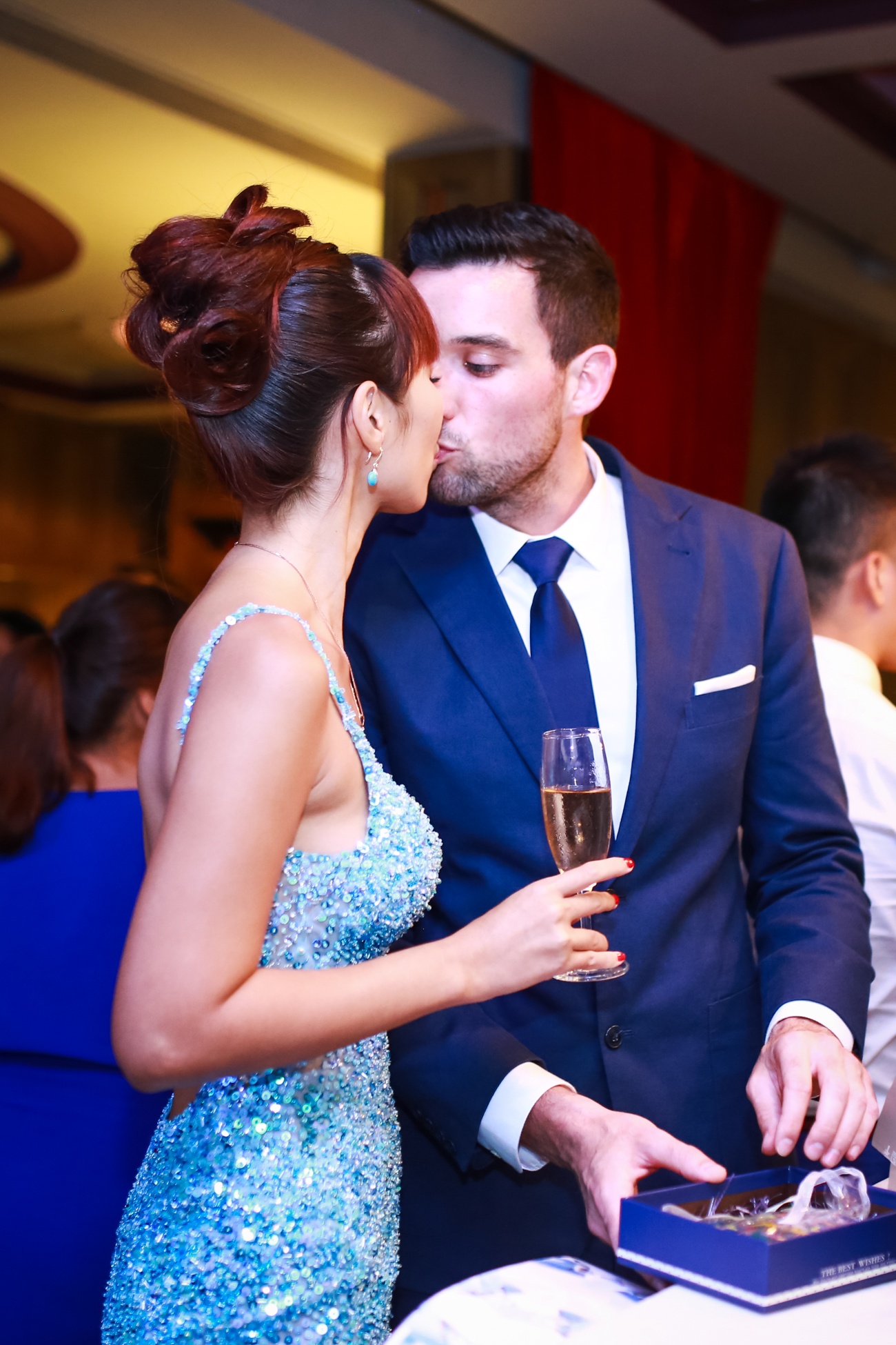 | Hà Anh và hôn phu trao nụ hôn say đắm bên nhẫn cưới mô phỏng. Bộ váy lấp lánh xanh nước biển của chân dài sinh năm 1982 có phom dáng cúp ngực, ôm sát khoe đường cong gợi cảm của cựu giám khảo Vietnam's Next Top Model. |