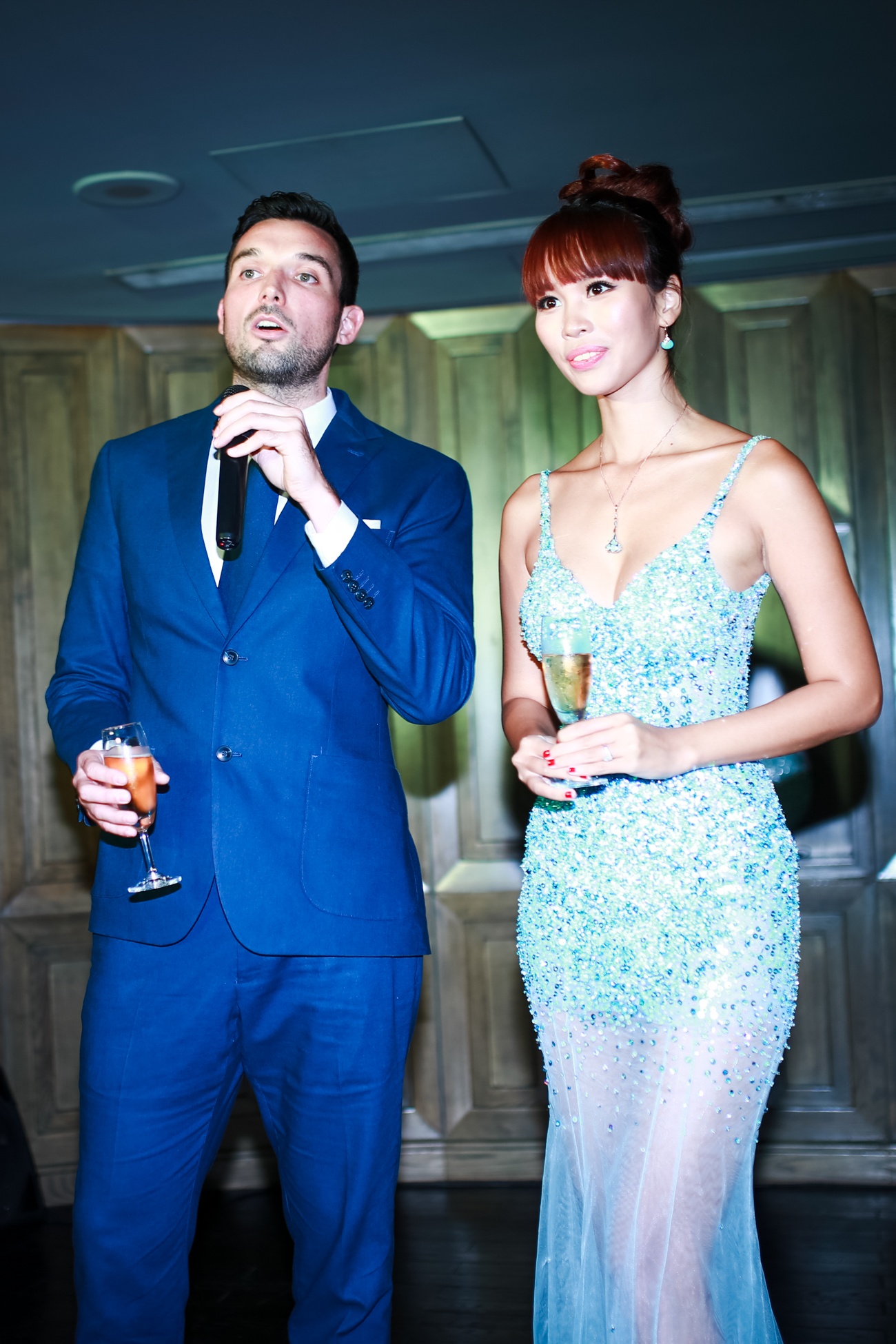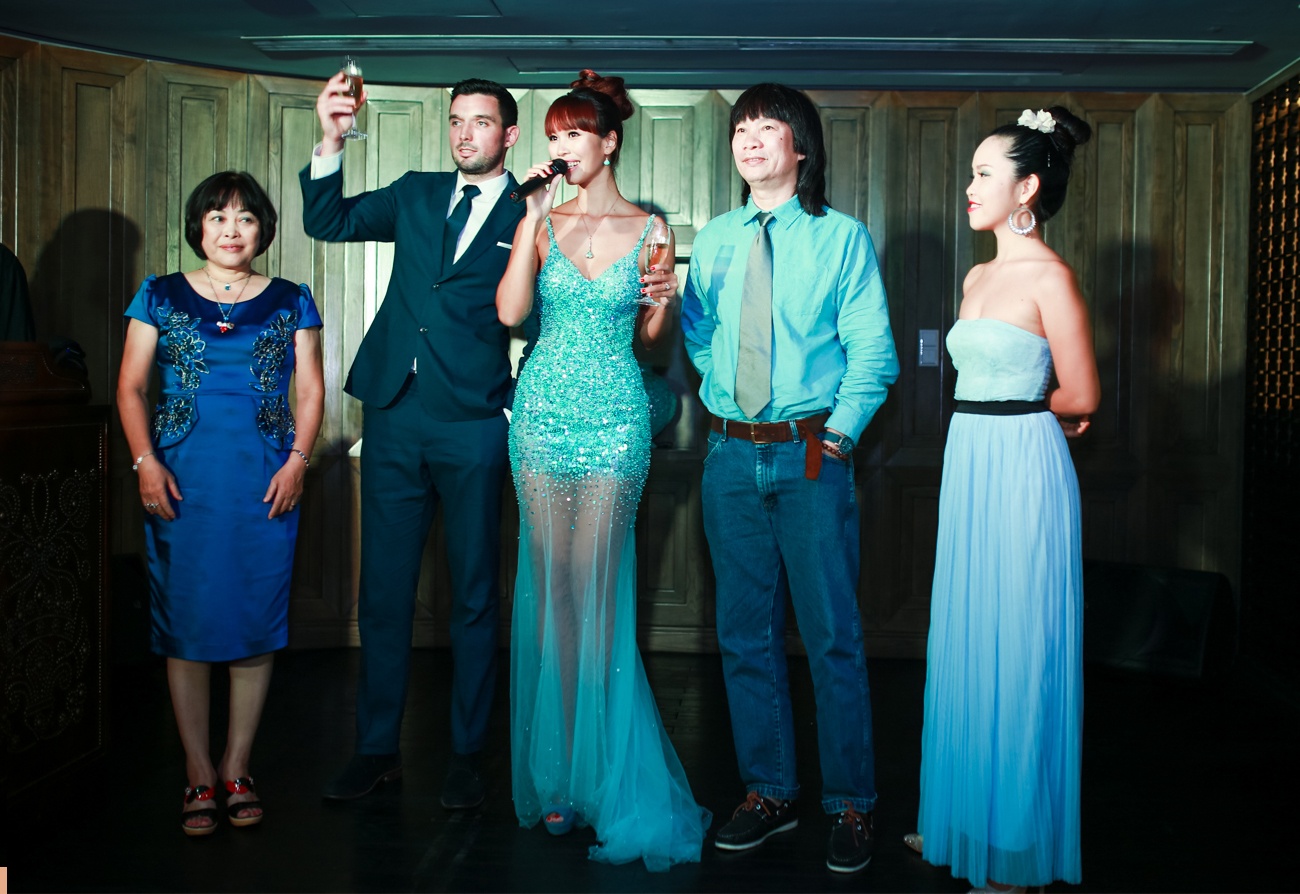| Hà Anh và hôn phu nâng ly cùng khách mời. Cô phát biểu về ngày vui và cảm ơn đấng sinh thành. Dù sống tự lập từ nhỏ nhưng chân dài vẫn được bố mẹ dạy cách trân trọng giá trị gia đình. |