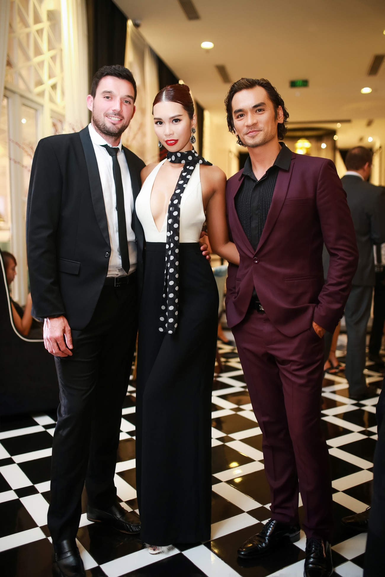 Dù bận rộn với chiến dịch quảng bá phim Bộ ba rắc rối, Kathy Uyên vẫn dành thời gian dự tiệc. Người đẹp nổi bật trong bộ cánh thanh lịch, tông màu trắng đen hợp xu hướng.