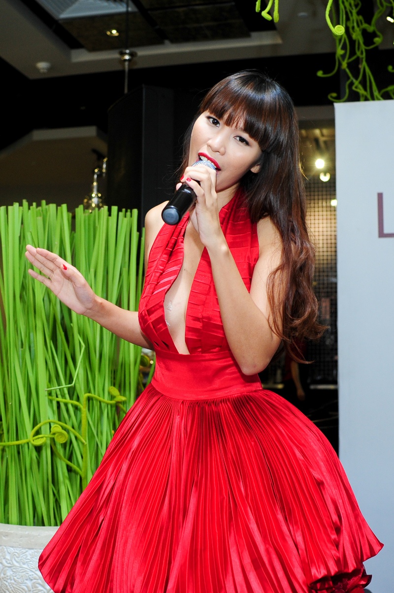 | Người đẹp tự tin thể hiện ca khúc do chính mình sáng tác trong buổi họp báo. |