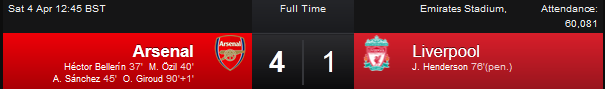 Kết thúc trận đấu, Arsenal giành chiến thắng 4-1 trước Liverpool ở vòng 31 Ngoại hạng Anh diễn ra trên sân nhà Emirates.