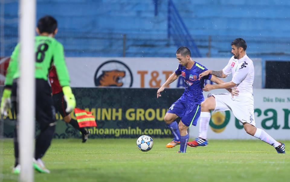 36': NGUY HIỂM. Sau quả tạt bên cánh phải, Ngọc Duy khống chế bóng và dứt điểm rất nhanh bằng chân phải. Tuy nhiên, hậu vệ của HAGL kịp cản phá thành công. Ngay sau đó, Văn Biển đánh đầu vọt xà sau tình huống đá phạt góc.