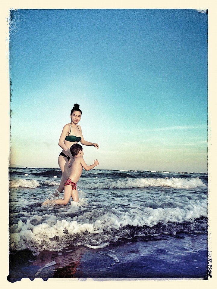 Hà Hồ cùng con trai Subeo tung tăng trên biển