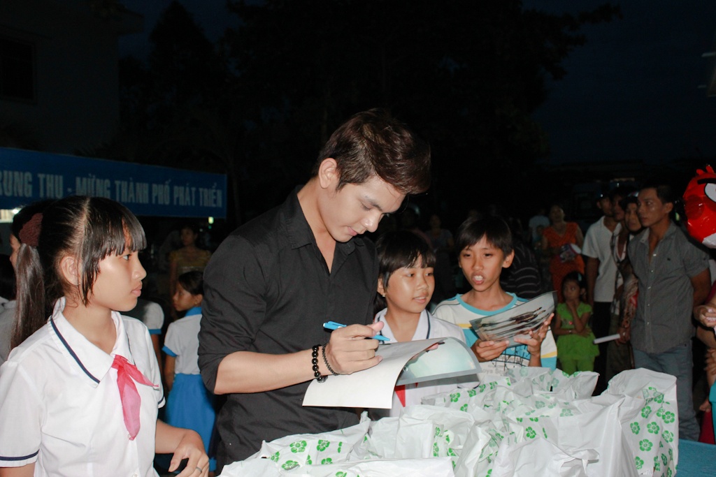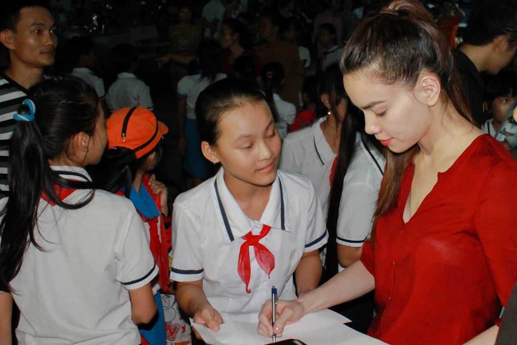 Nữ ca sĩ và các thành viên của V.Music không ngần ngại ký tên tới mỏi tay vào những tấm hình tặng các em nhỏ.