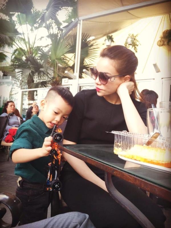 | Cậu bé mê mẩn khám phá đồ chơi mới trong khi Hà Hồ khoan khoái tận hưởng không khí tĩnh lặng tại một quán cà phê Thủ đô những ngày đầu năm. |