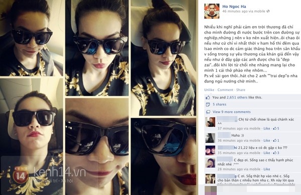Nữ ca sĩ chia sẻ, cô đã từ lời mời của BTC chương trình vì đã tham gia một show diễn ở Hà Nội. Ngoài ra, cô cũng không quên nhấn mạnh mình đang trên máy bay về Sài Gòn để hát cho hai "trai đẹp" đang ngủ nướng ở nhà chờ cô. Dĩ nhiên, hai "trai đẹp" của Hồ Ngọc Hà không ai khác chính là ông xã Cường Đô la và bé Subeo.