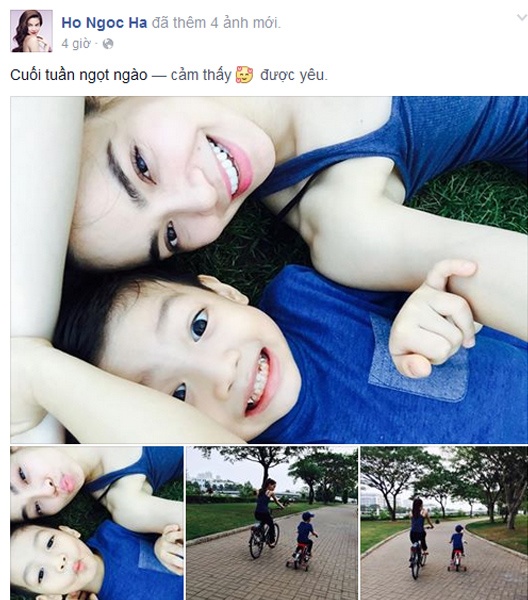 Trong ảnh, Hồ Ngọc Hà và Subeo mặc trang phục ton sur ton, thoải mái đạp xe hay nằm dài trên bãi cỏ. Các fan của nữ ca sĩ đều cho rằng đây là khoảnh khắc tuyệt vời của hai mẹ con khi trong năm 2014 vừa qua, Hồ Ngọc Hà hầu như bận rộn chạy show và thực hiện các hoạt động trong chuỗi kỷ niệm 10 năm ca hát của mình.