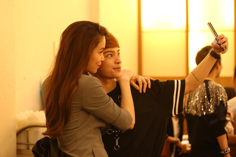 | Hà Hồ chụp ảnh tự sướng với stylist Keibin Le. |