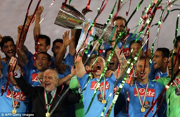 | Chủ tịch Aurelio De Laurentiis hòa cùng niềm vui của các cầu thủ Napoli. |