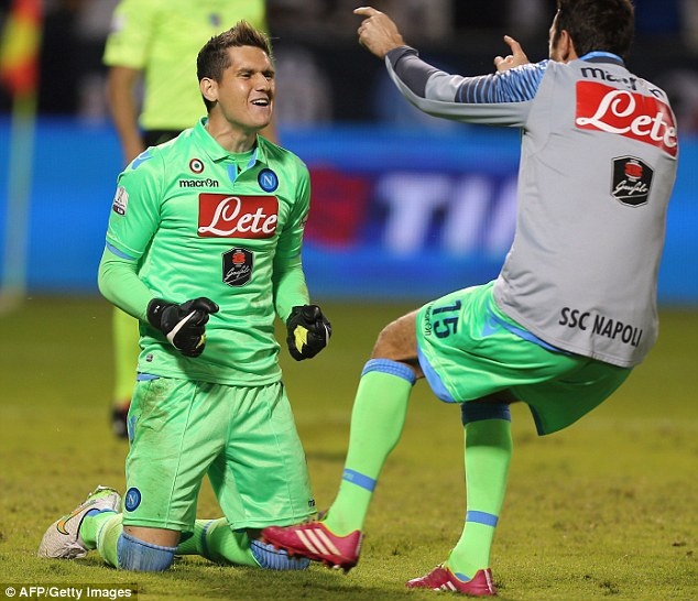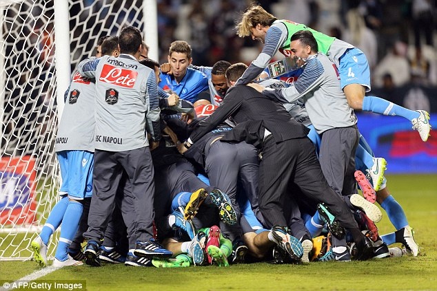 | Niềm vui của các cầu thủ Napoli sau khi Rafael cứu cản phá thành công cú sút của Padoin ở lượt đá thứ 9. |