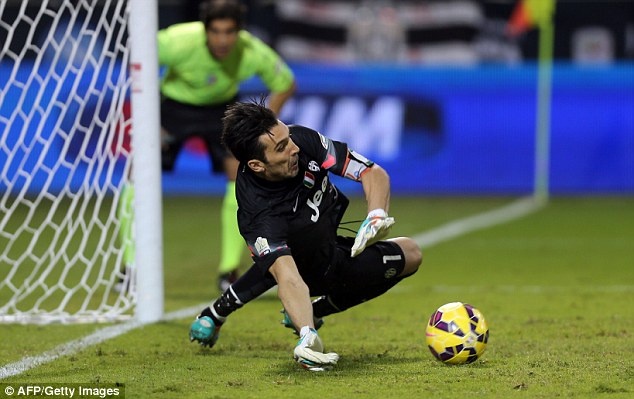 Ở loạt đấu súng cân não, thủ thành Buffon thể hiện phong độ tuyệt vời khi tung ra 3 pha cứu thua cho nhà đương kim vô địch Serie A.