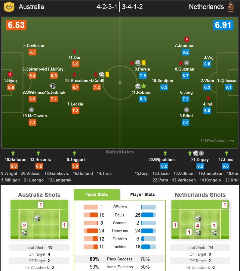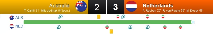 20': Sau khi giành bóng từ chân của cầu thủ Australia ở khu vực giữa sân, Robben băng xuống như một mũi tên xông thẳng vào trung lộ của đối phương. Cú sút chân trái quyết đoán chéo góc của Robben quá hiểm khiến thủ thành Ryan không có cơ hội cản phá. Tỷ số là 1-0 cho Hà Lan.
