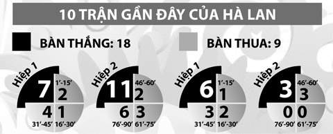 + 3/4 trận của ĐT Hà Lan tại World Cup lần này kết thúc với từ 3 bàn trở lên. Trái ngược, 3/4 trận của Costa Rica có dưới 2 bàn thắng cả trận.