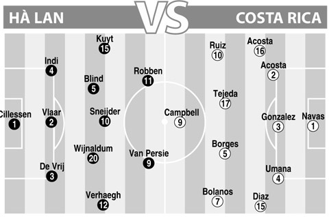 Thêm vào đó, trong hành trình đã qua, thực tế Costa Rica chưa phải đụng độ hàng công nào thực sự sắc bén. Uruguay không có Suarez, Italia thiếu đi sự chỉnh chu của Balotelli, ĐT Anh thì khỏi bàn (họ ra sân với đội hình dự bị). Thiếu đi những trải nghiệm thực tế, sẽ rất khó cho Costa Rica khi phải đối đầu “song sát” Robben - Van Persie.