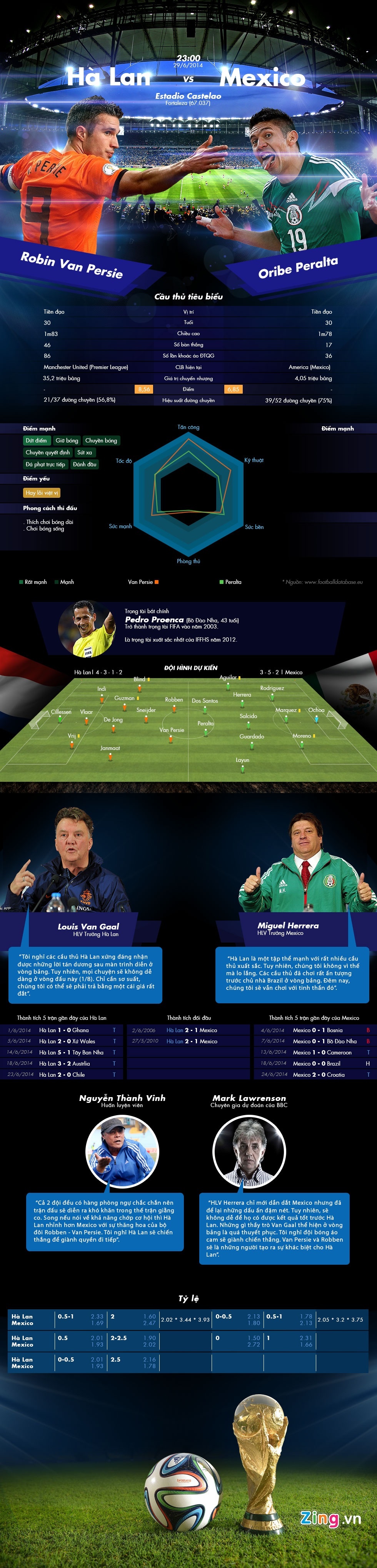 Hà Lan đang vô cùng thăng hoa sau 3 trận toàn thắng tại vòng bảng. Cùng với sự trở lại quan trọng của Van Persie, nhiều khả năng cơn lốc cam sẽ cuốn phăng El Tri khỏi World Cup.