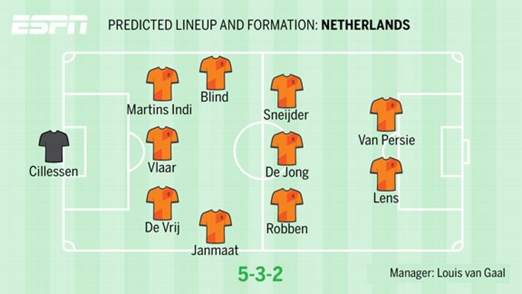 | Đội hình dự kiến của Hà Lan theo sơ đồ chiến thuật 5-3-2. Ảnh: Espn. |
