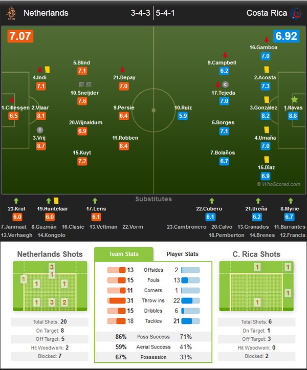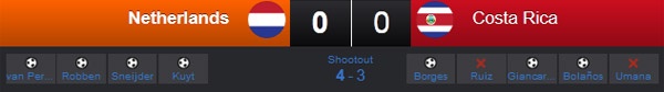 Không thể phân định thắng bại sau 90 phút chính thức và 2 hiệp phụ, Hà Lan và Costa Rica phải cạnh tranh vé vào bán kết bằng loạt sút penalty. Nhờ sự xuất sắc của Tim Krul, thủ môn vào thay Cillessen ở cuối hiệp phụ thứ 2, tuyển cơn lốc màu da cam chiến thắng với tỷ số chung cuộc 4-3 và giành quyền vào bán kết gặp Argentina.