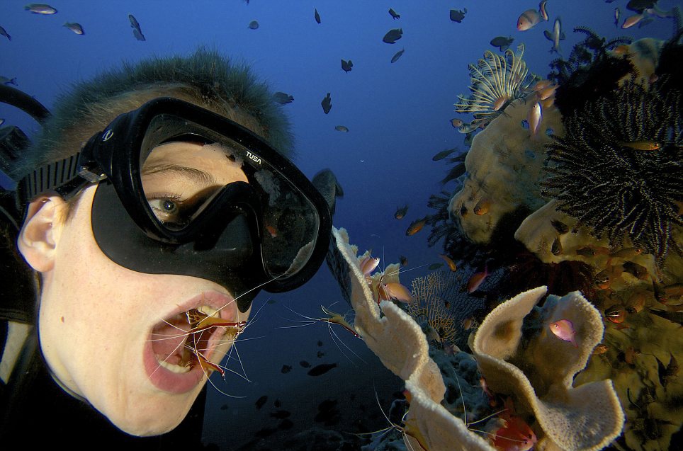 “Tôi đã theo dõi cách những con tép vệ sinh răng miệng cho các loài cá trước khi quyết định thử cảm giác đó. Thật tuyệt với khi những con tép đầu tiên chui vào làm sạch răng miệng”, Russell chia sẻ. Ảnh: Daily Mail. |