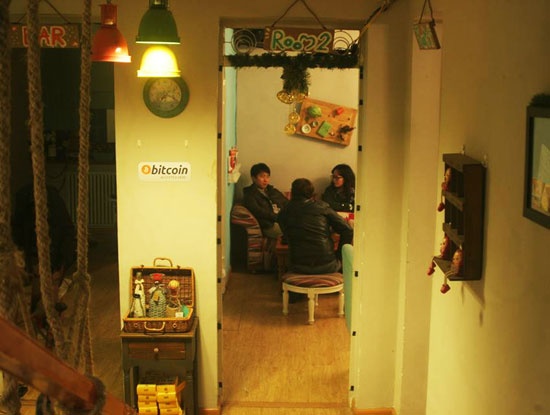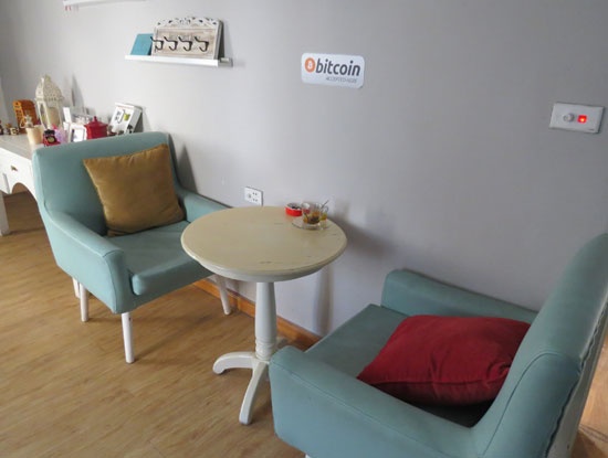 | "Bitcoin Accepted Here" xuất hiện ở mọi nơi trong quán Yolo. |