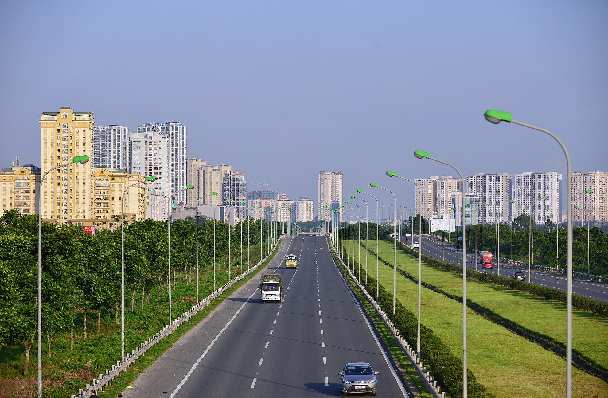 Tại hướng Tây Nam, người dân đi trên Đại lộ Thăng Long nhìn về trung tâm thủ đô là những tòa nhà san sát, tạo cảm giác như đang ở nước ngoài. Ảnh: Lê Hiếu.