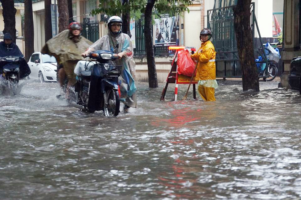 Sau khi mưa chừng 15 phút, nước bắt đầu ngập nửa bánh xe tại phố Quán Thánh, đoạn trước cổng trường Tiểu học Nguyễn Tri Phương, quận Ba Đình. Ảnh: Mạnh Thắng