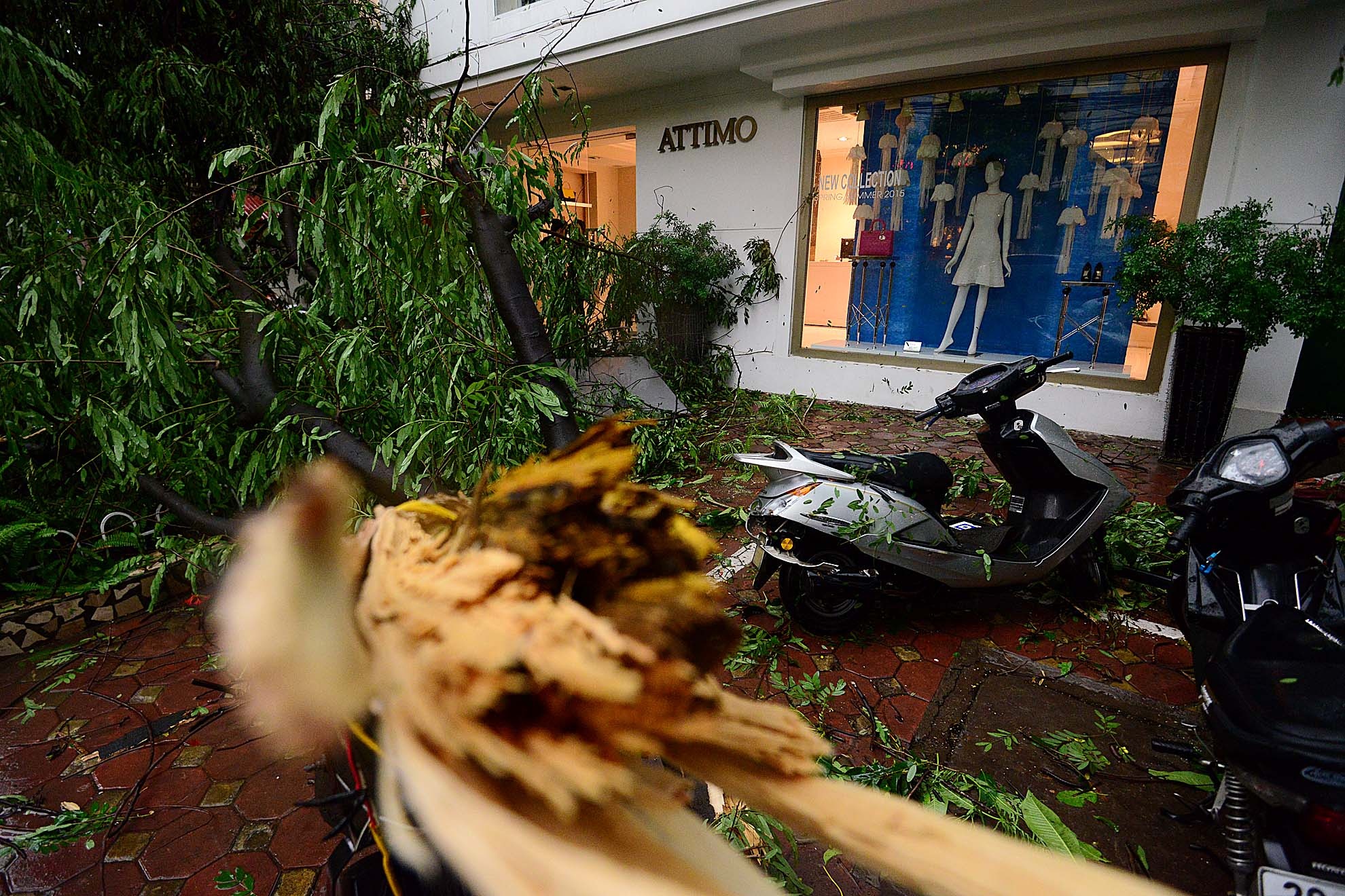Do không kịp di chuyển, nên nhiều xe máy trên phố Phan Chu Trinh bị gốc cây sấu khá lớn đè lên.