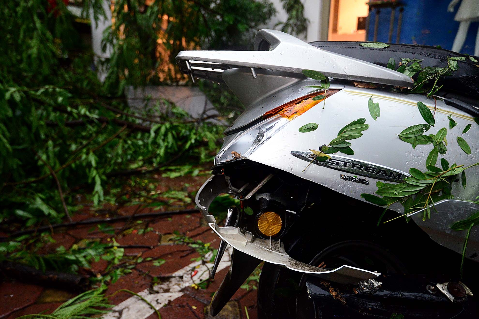 | Chiếc xe máy vỡ phần yếm và phía sau do chịu lực tác động của cây đổ. |
