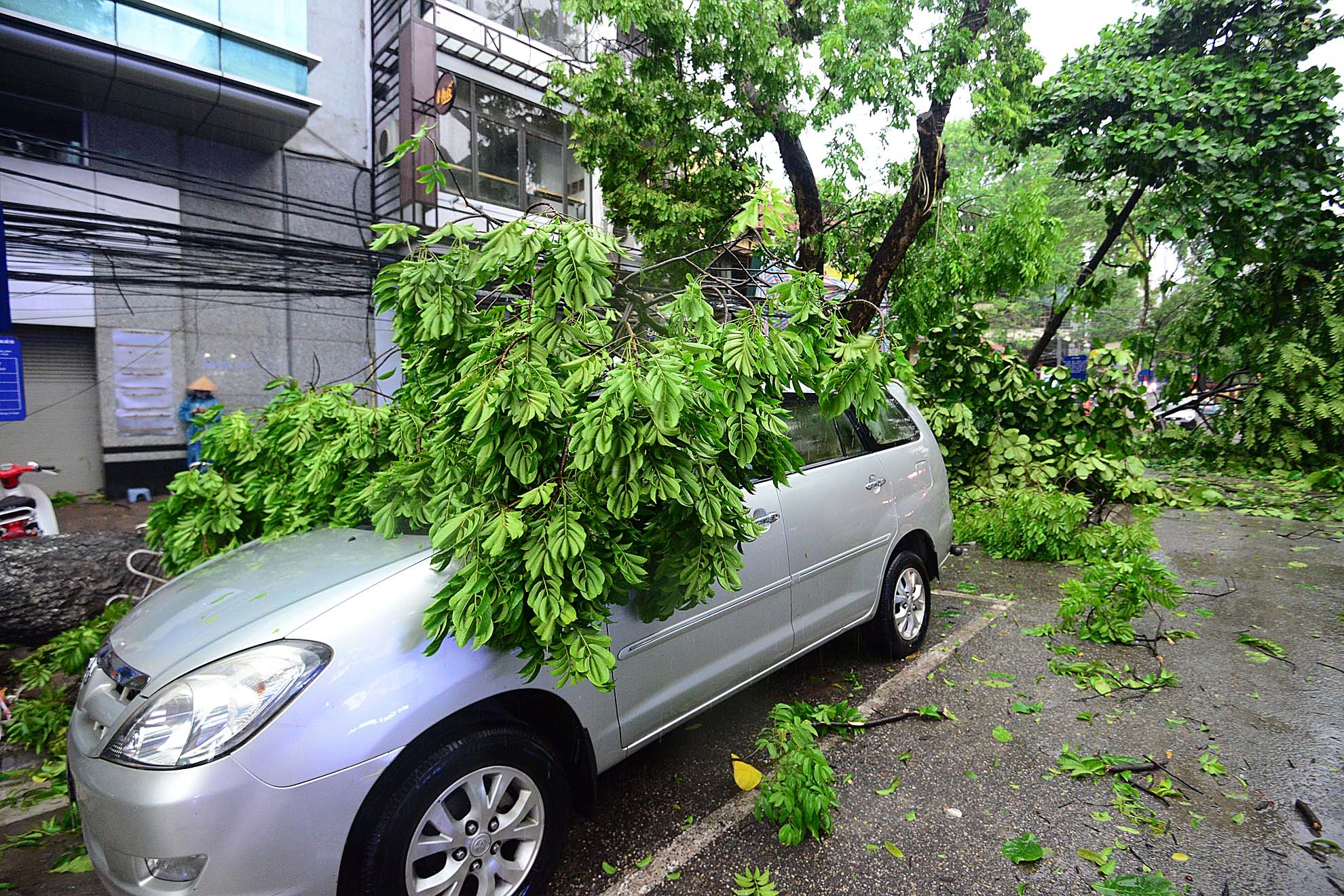 | Chiếc xe bị cành cây đè trên phố Lý Thường Kiệt. |