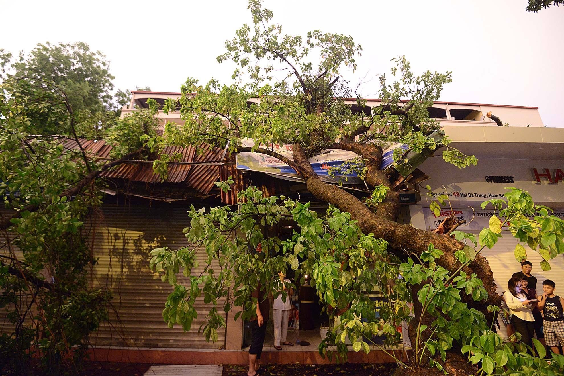| Cây đổ làm sập nhà trên phố Hai Bà Trưng. |