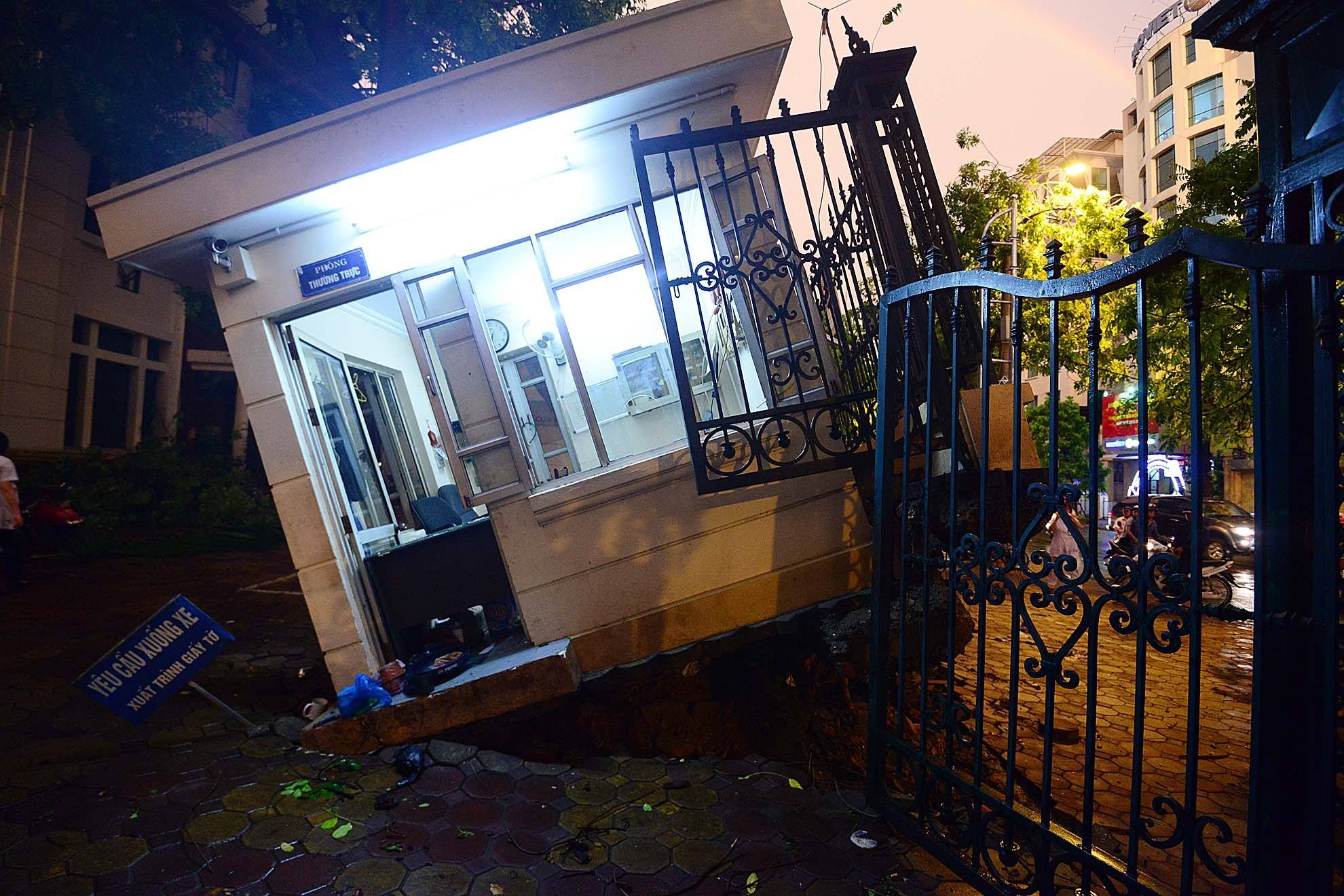 | Cổng bảo vệ Hội đồng dược điển (Bộ Y Tế) trên phố Hai Bà Trưng bị nhấc bổng do phía dưới là rễ cây xà cừ bung gốc. |