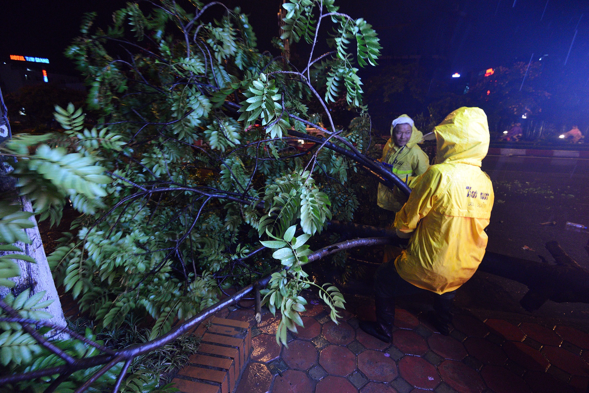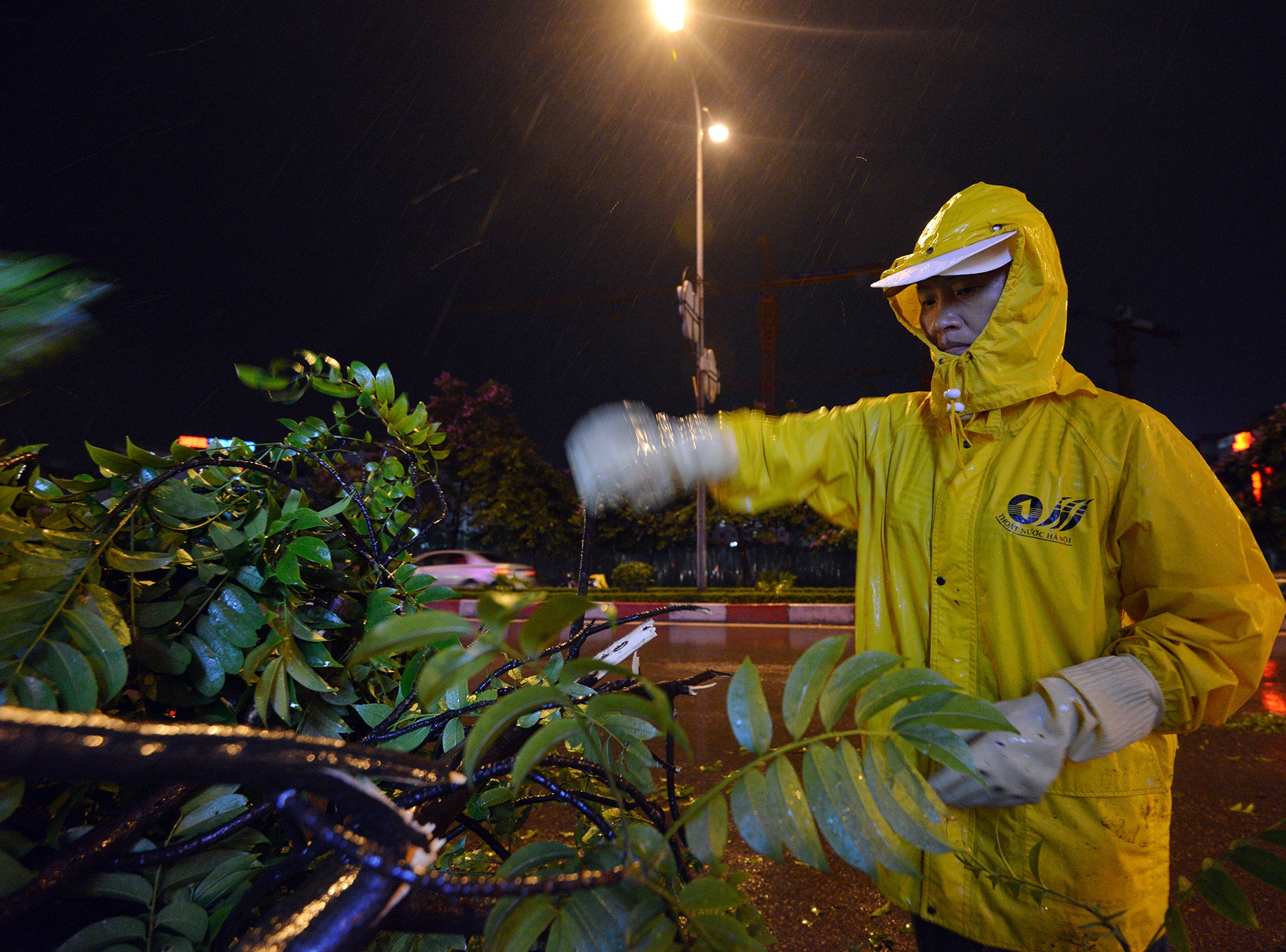 Lượng mưa đo được không lớn, nhưng gió giật mạnh khiến hàng loạt cây xanh trên nhiều tuyến phố như Duy Tân, Mễ Trì, Phạm Hùng, Cầu Giấy, Chùa Láng đổ gãy. Trong ảnh là công nhân Công ty thoát nước Hà Nội dọn dẹp thân, cành cây gãy đổ trên đường Trần Thái Tông khi mưa tạm ngớt.