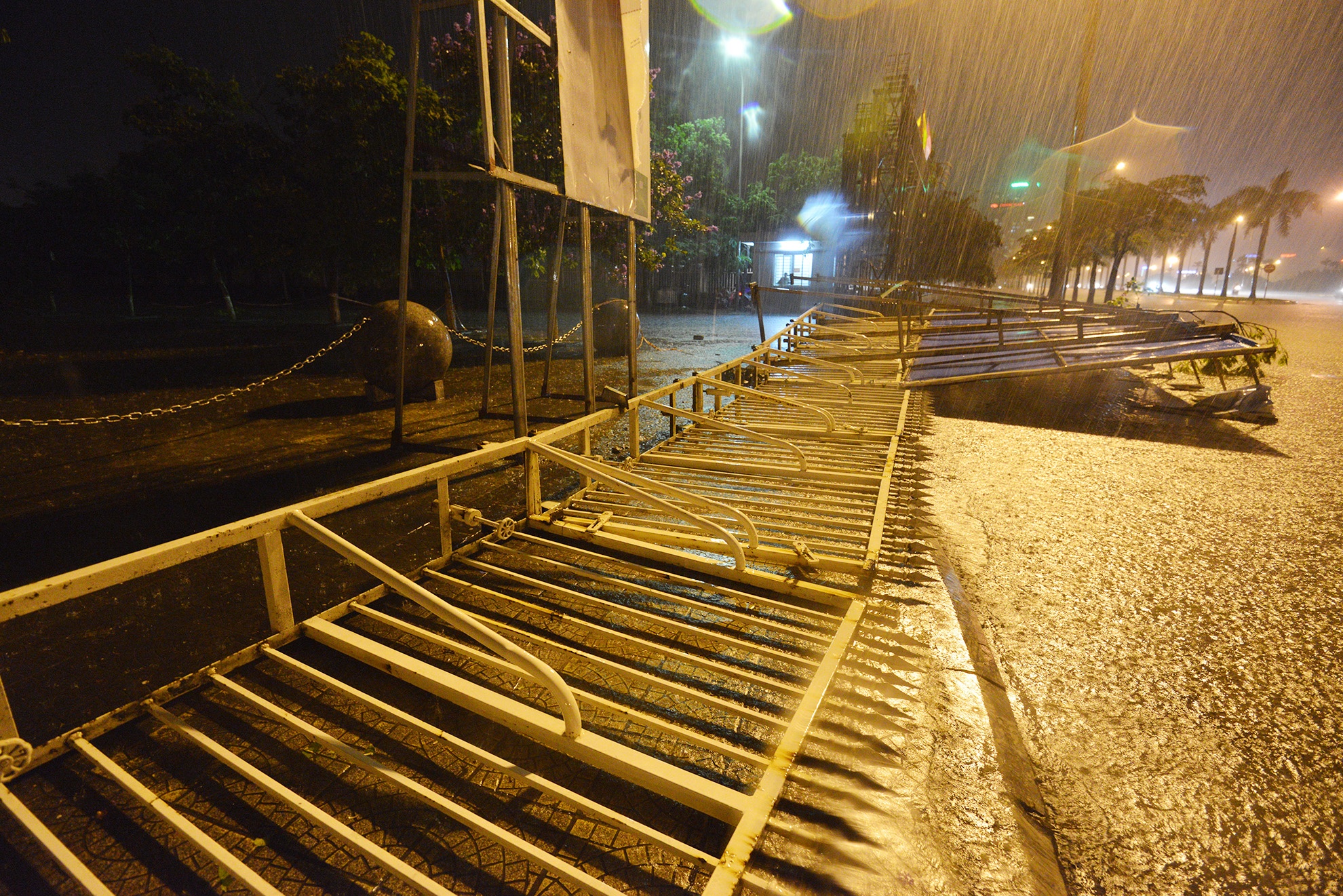 Mưa lớn, kèm gió mạnh xô đổ hàng rào chắn sân vận động Mỹ Đình.