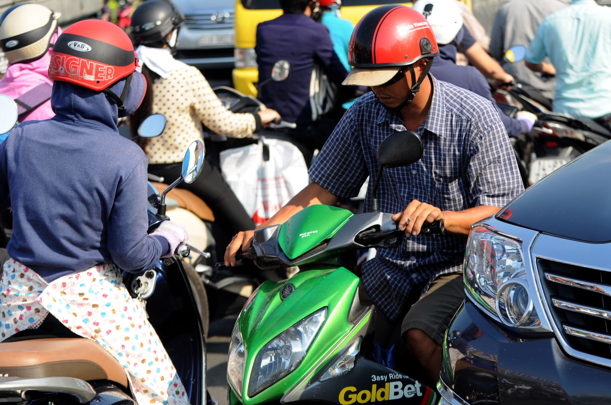 | Người đàn ông cố lách qua khe hẹp giữa ôtô và xe máy để di chuyển. Thời điểm nhiều người cùng đi làm nên trước cổng KCN Tân Bình, giao thông khá hỗn loạn. |