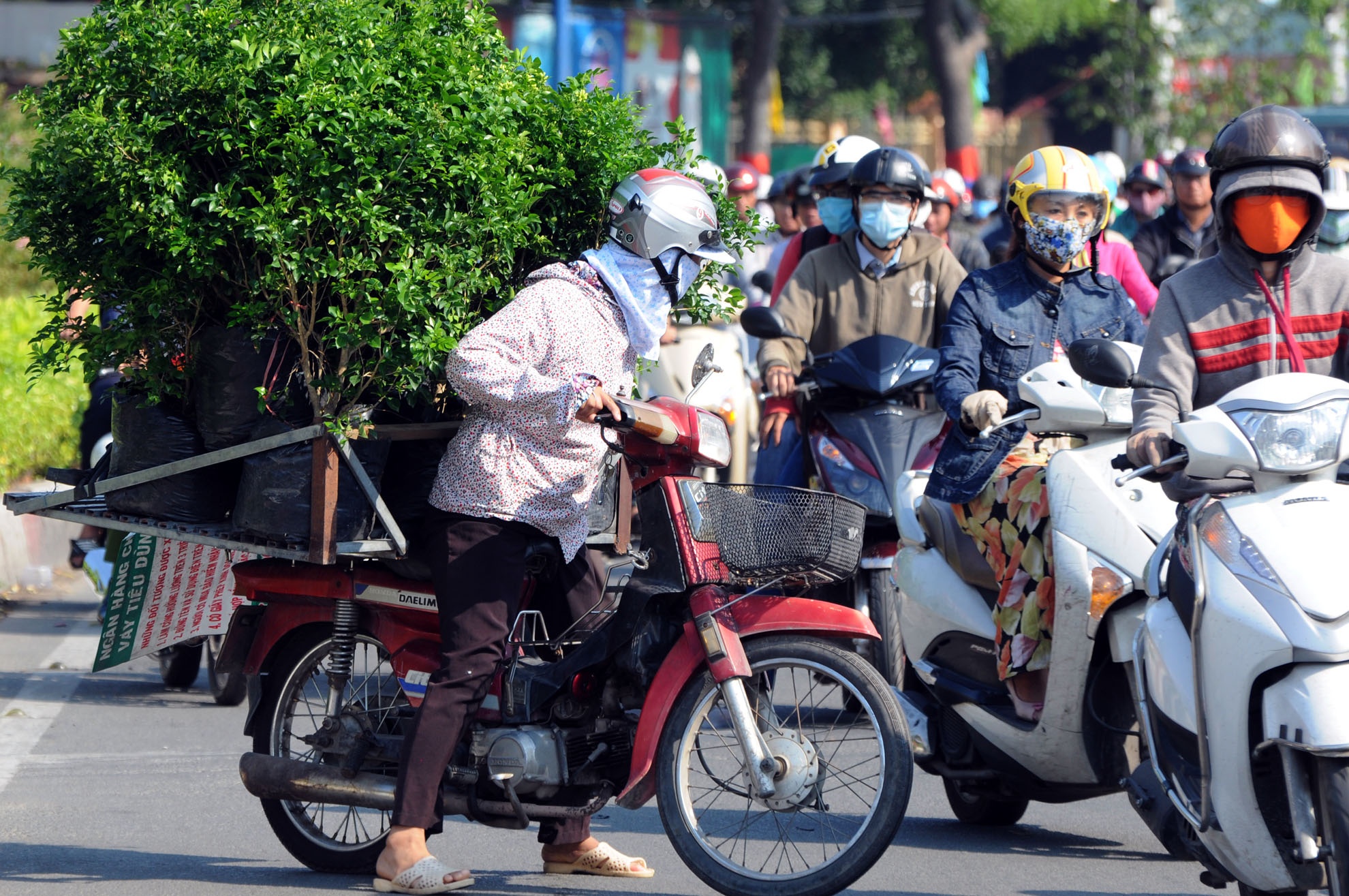 | Người phụ nữ bán cây cảnh đứng chờ dòng xe cộ vãn để có thể đi qua đường. |