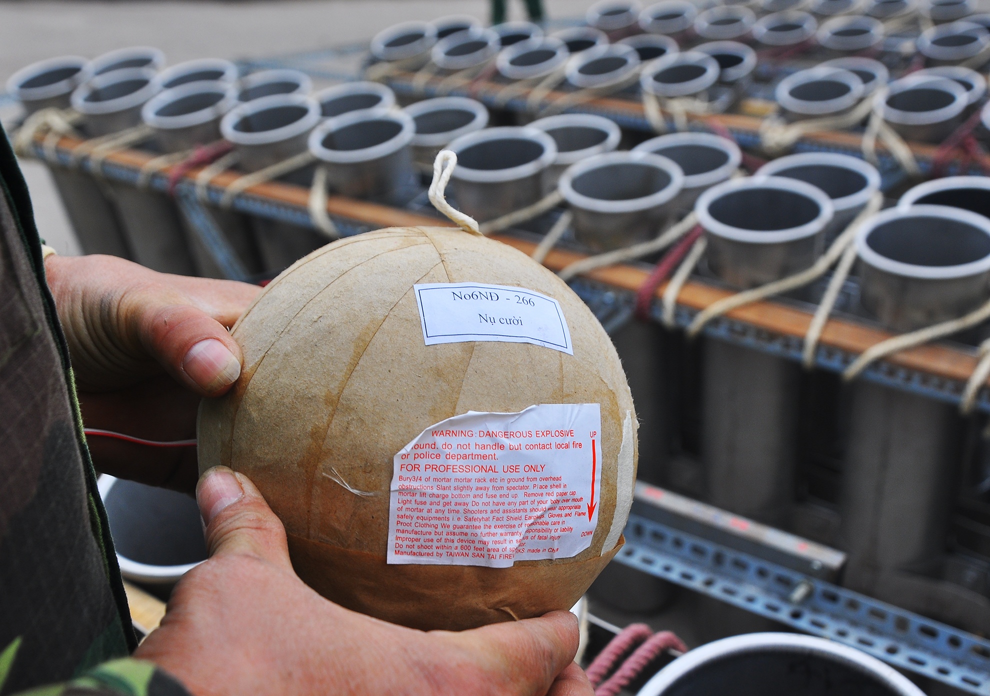 | Những quả pháo có ký hiệu số thứ tự, hình hoa được lắp vào giàn. |