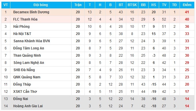 Bảng xếp hạng sau vòng 20