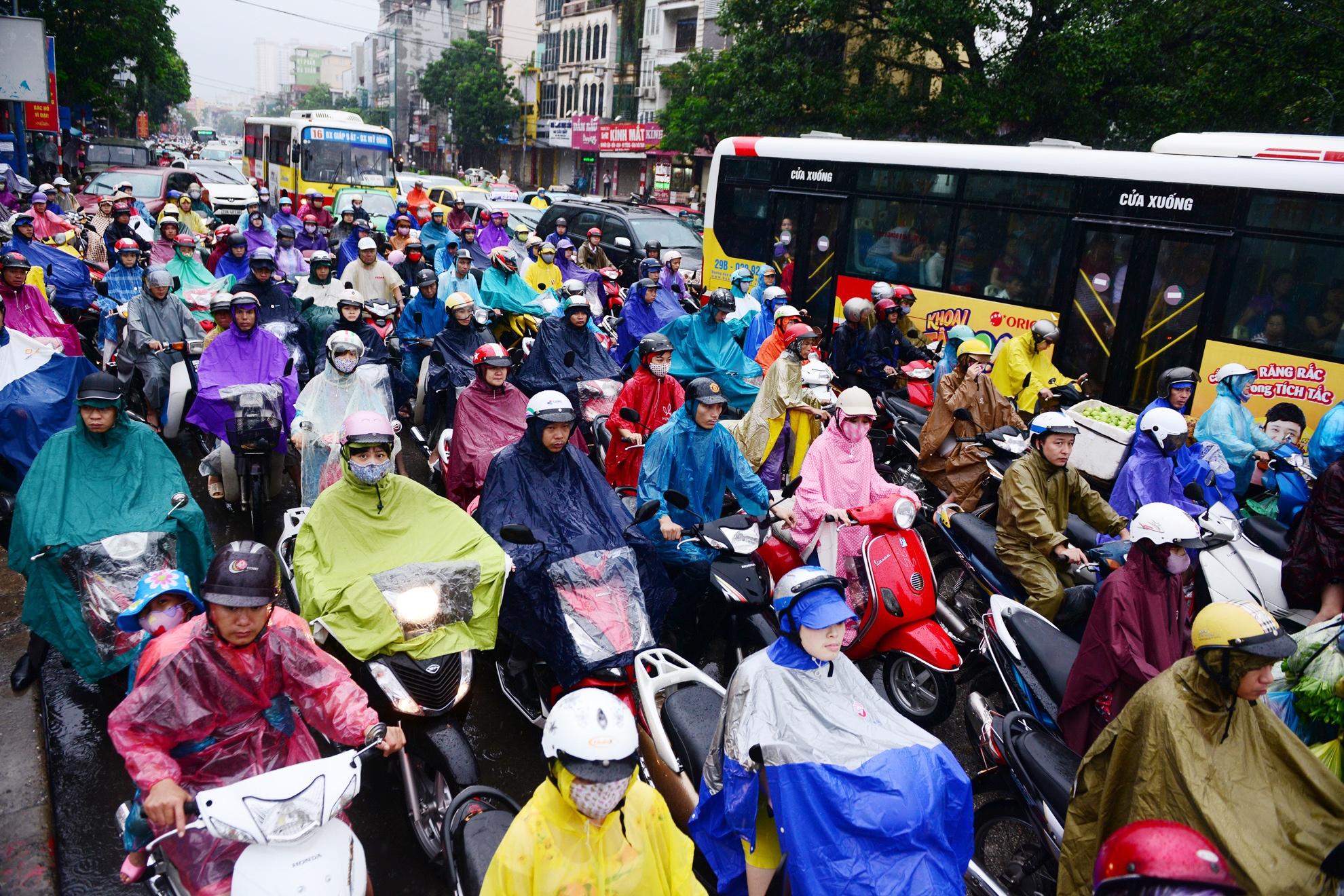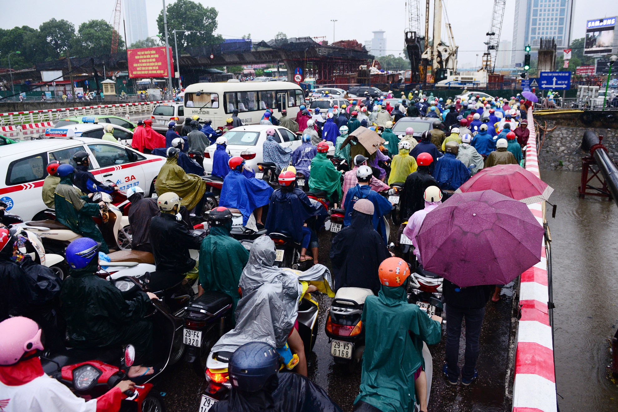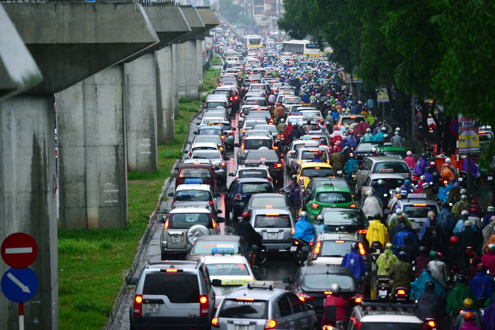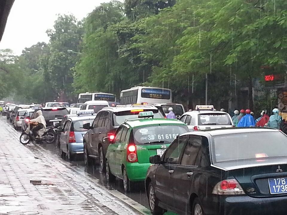 | Đường Cầu Giấy (quận Cầu Giấy) ùn tắc dài cả cây số khiến nhiều người buộc phải chôn chân giữa trời mưa. |