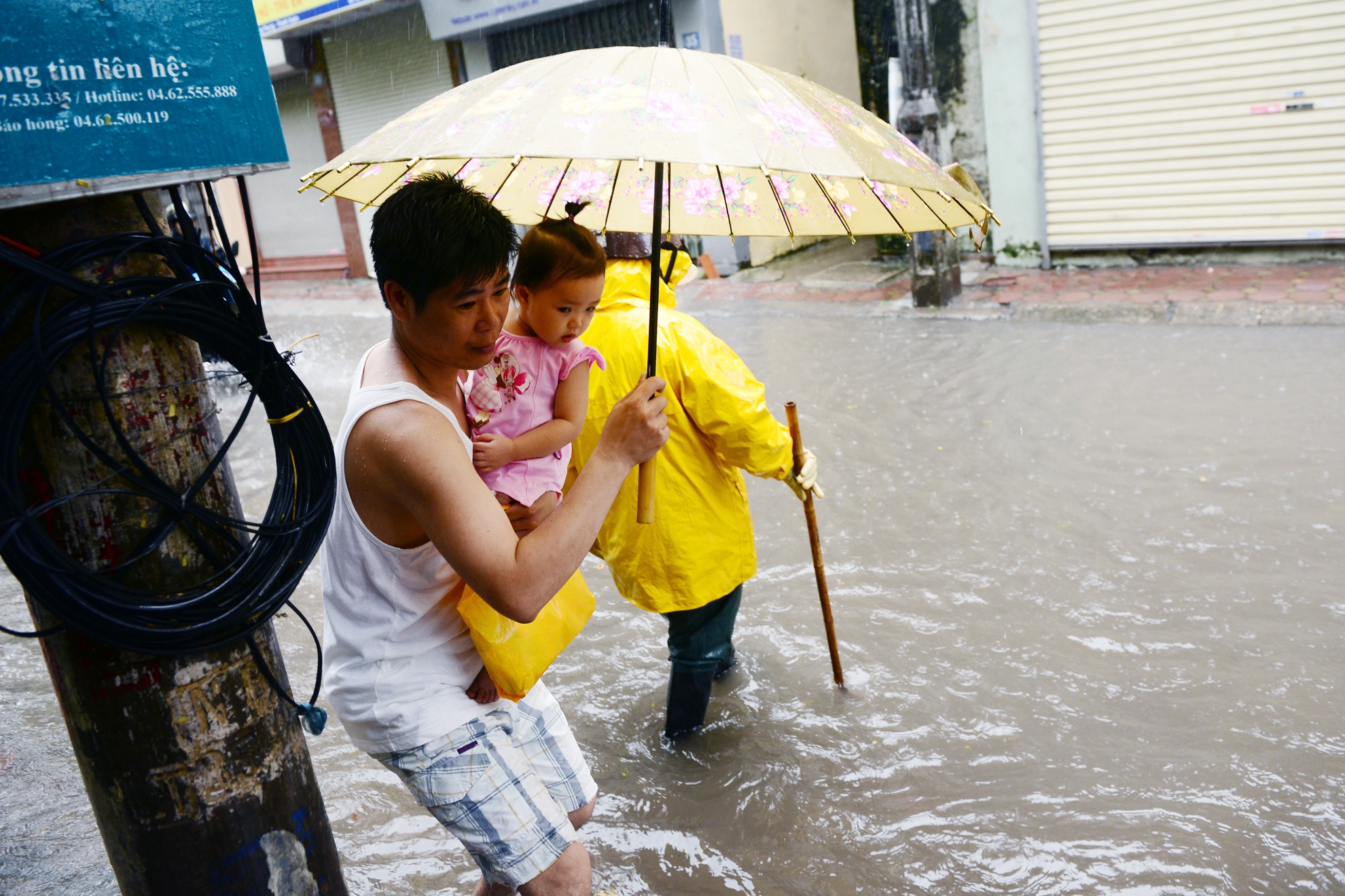 Vài giờ sau trận mưa lớn, nhiều tuyến phố ở Hà Nội sáng nay rơi vào cảnh ngập úng, ùn tắc kéo dài cả cây số. Nhiều phụ huynh phải lội nước đưa trẻ tới trường.