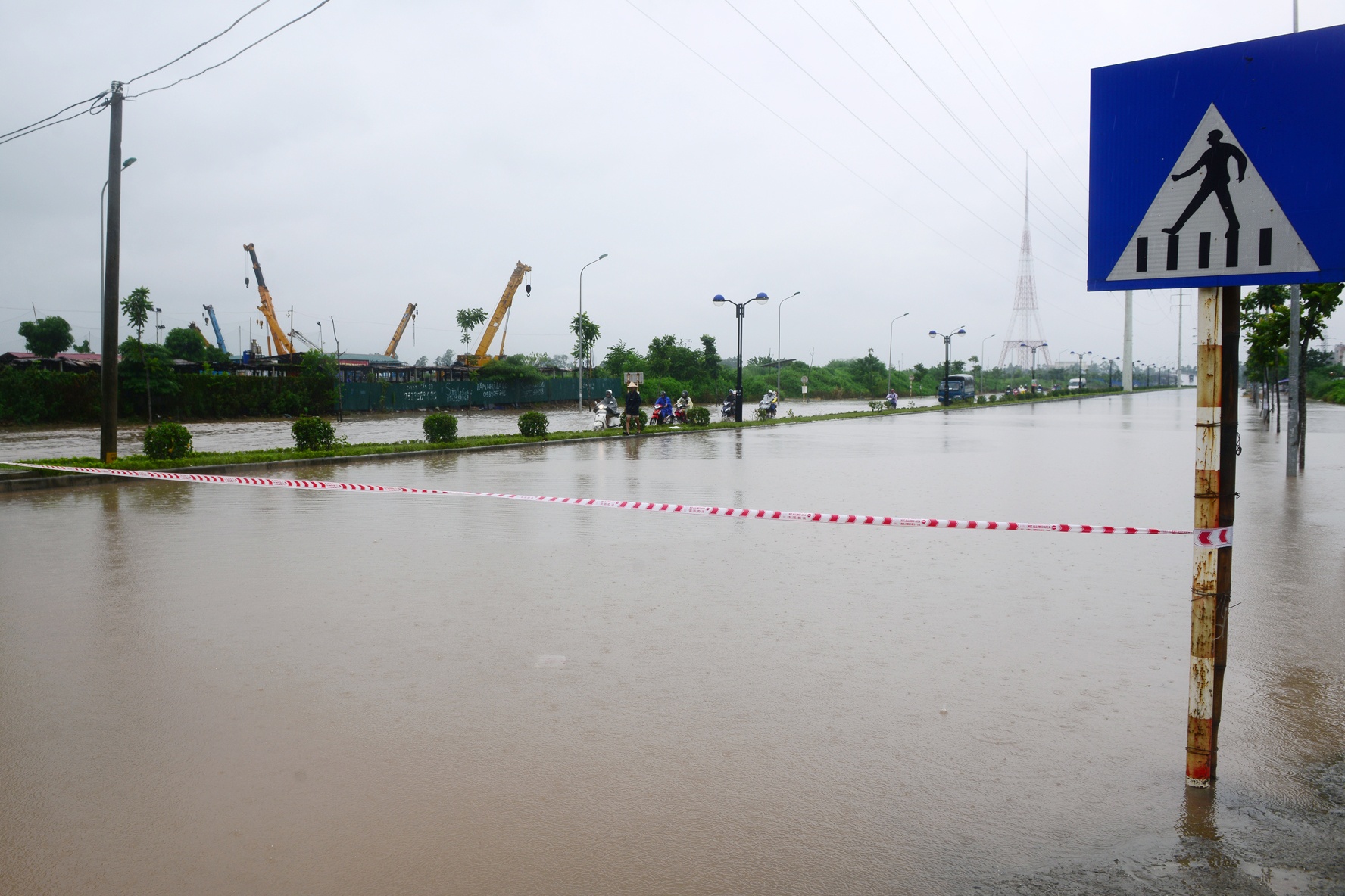 | Nhiều tuyến đường gần khu vực cầu Nhật Tân (quận Tây Hồ) cũng chìm trong nước. Ảnh: Thanh Tuyền. |