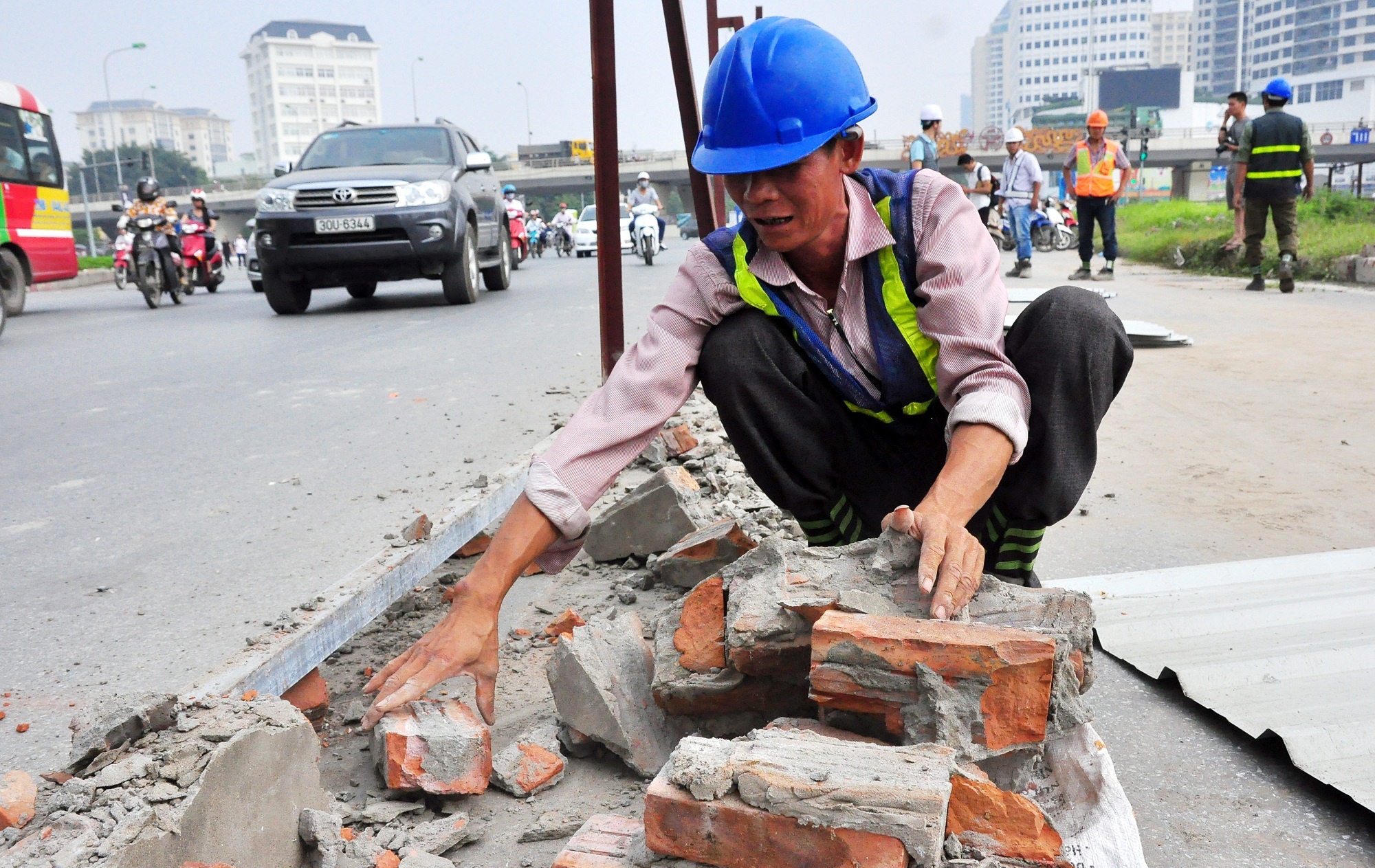 Móng rào chắn bằng gạch, xi măng được công nhân phá bằng búa và thu dọn.