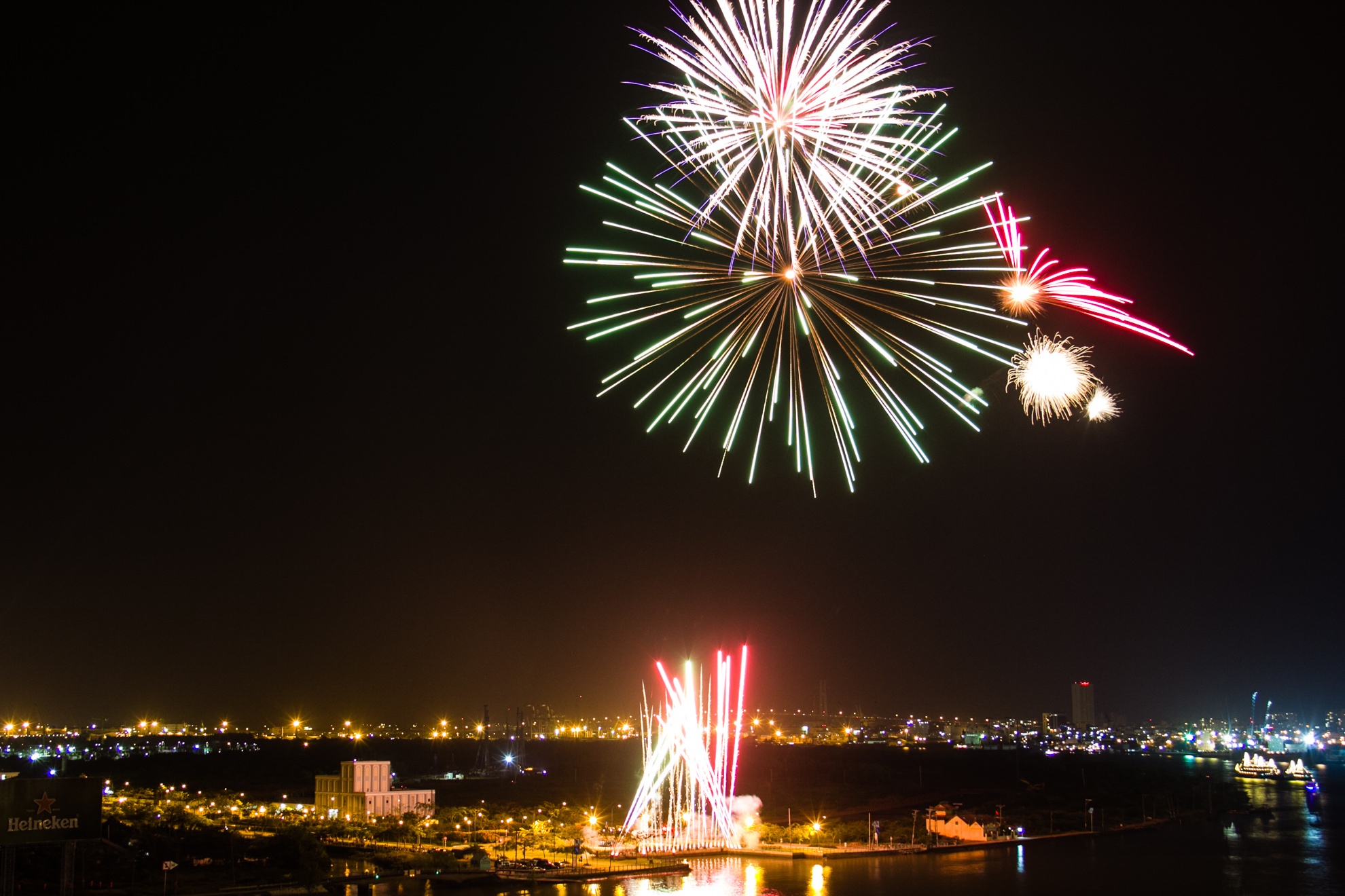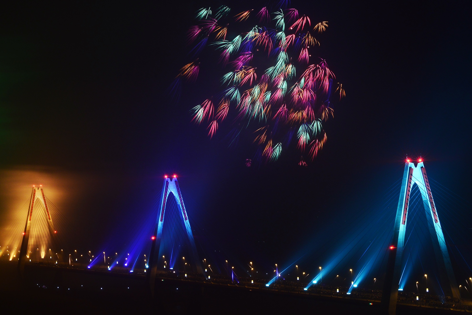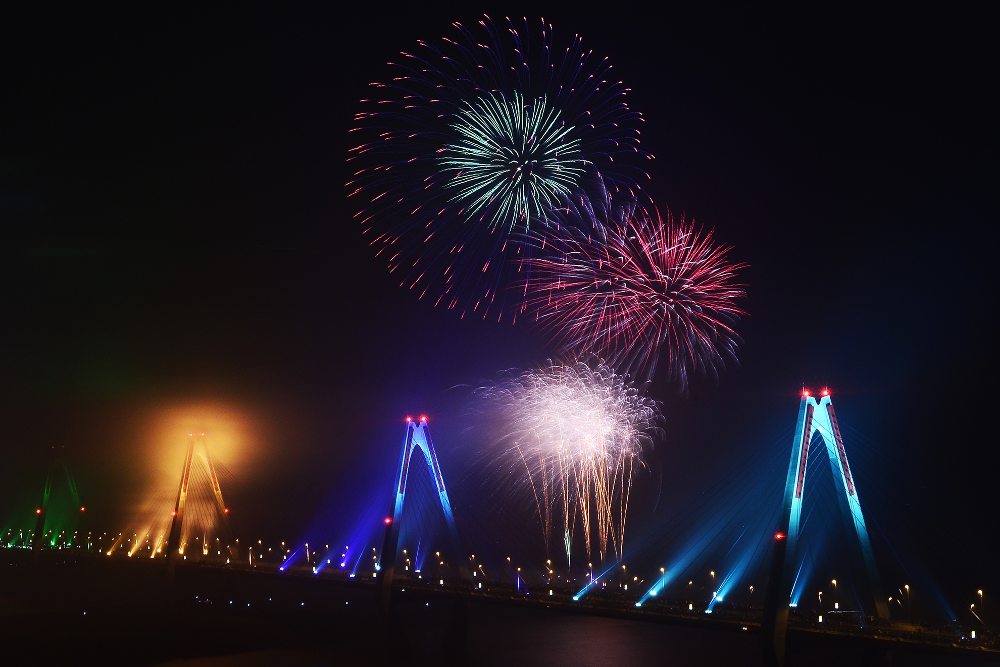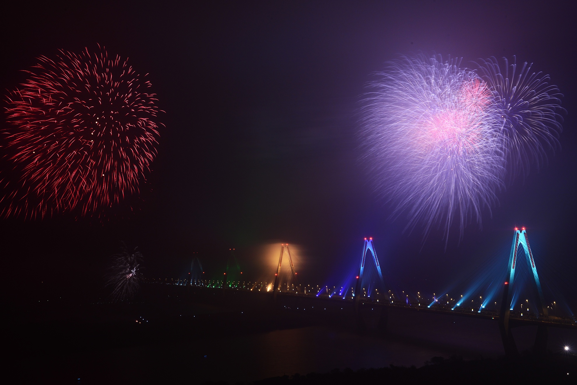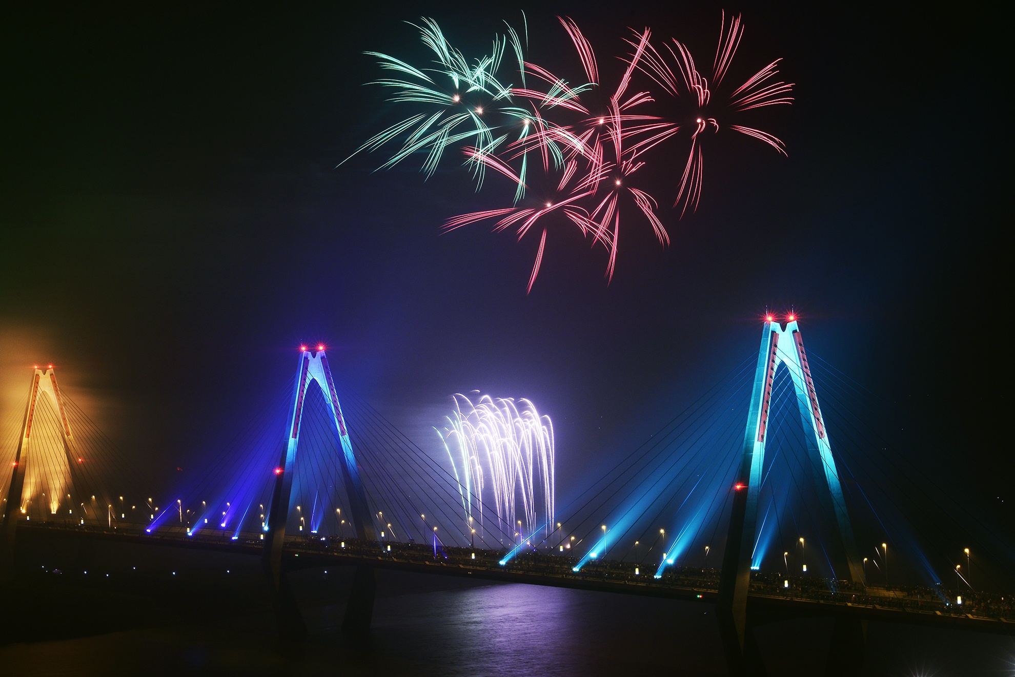 | Pháo hoa kết hợp với ánh sáng đủ màu sắc cầu vồng của cầu Nhật Tân khiến buổi trình diễn thêm phần ấn tượng. |