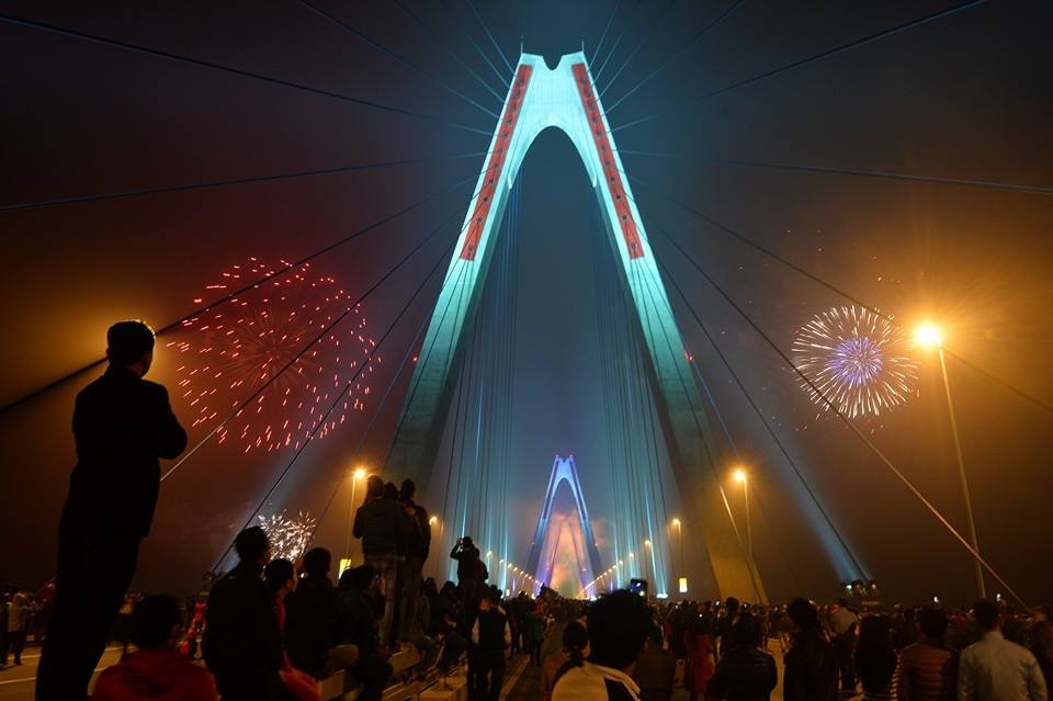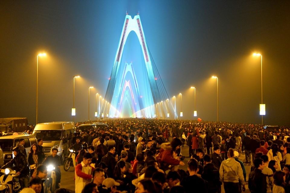 | Tại Hà Nội, cầu Nhật Tân kín đặc người. Dù khá xa khu trung tâm, hàng nghìn người dân vẫn đổ về đây đón chờ màn pháo hoa nghệ thuật duy nhất trong đêm giao thừa ở thủ đô. |