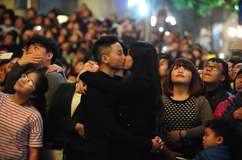 | Nhiều đôi tình nhân không ngại trao nhau cử chỉ âu yếm vào thời khắc chuyển giao sang năm Ất Mùi. |