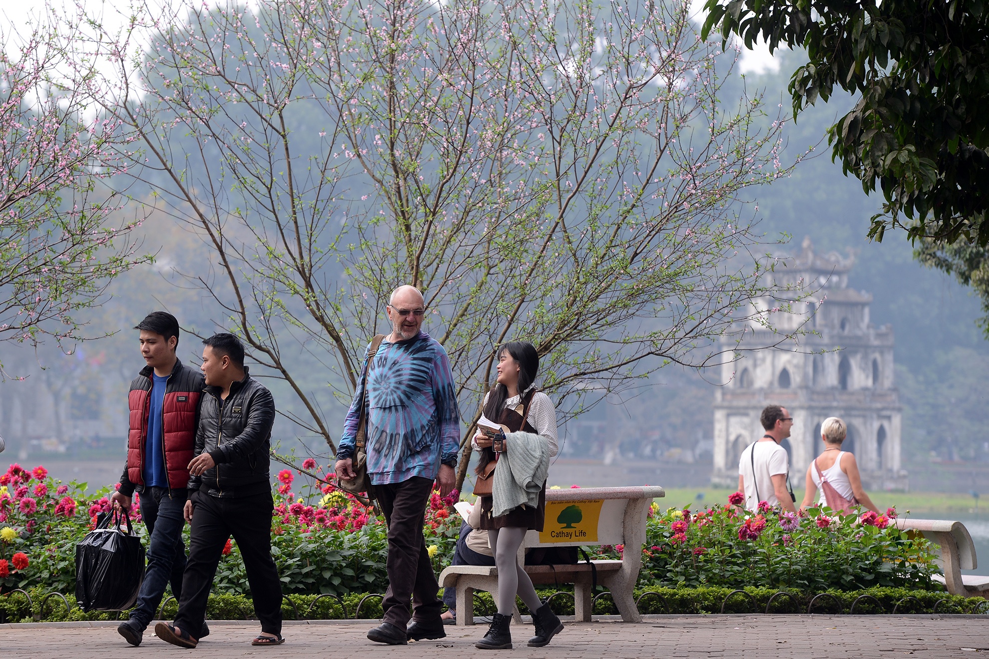 Hà Nội như rộn ràng sắc xuân hơn khi hàng trăm cành đào phai bày trồng dọc ven bờ hồ.