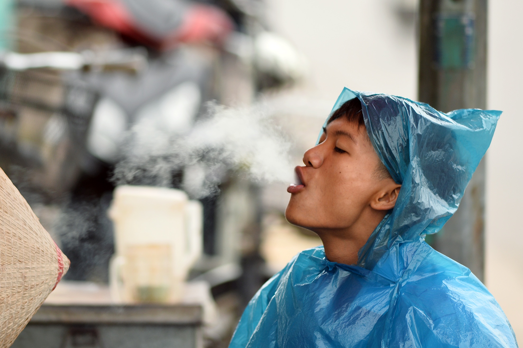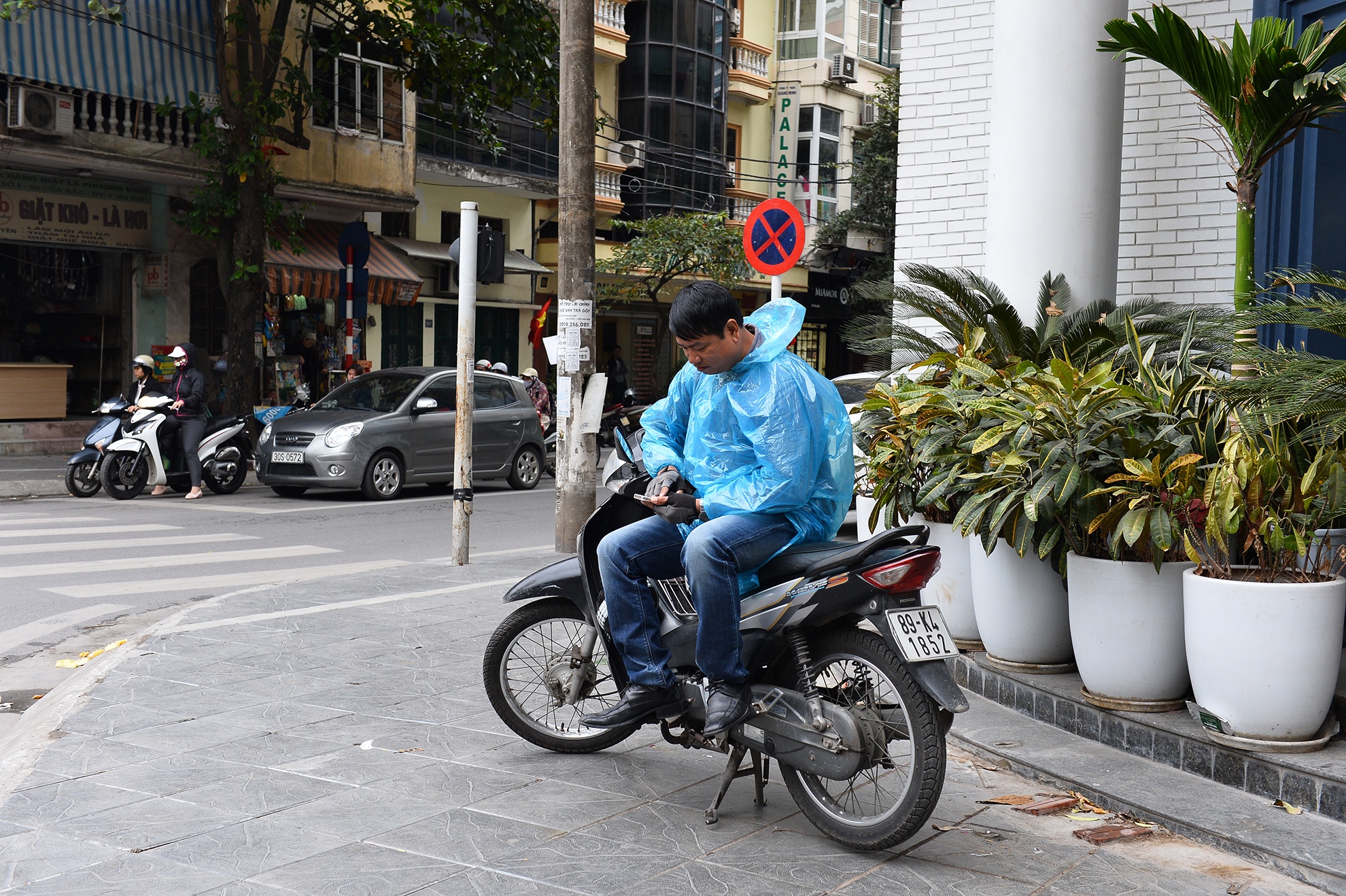 | Một thanh niên hành nghề xe ôm tại ngã tư Cửa Bắc - Quán Thánh mặc áo mưa cho đỡ lạnh. Anh cho biết, mặc hai áo dày rồi nhưng vẫn phải thêm lớp nylon chống gió. |