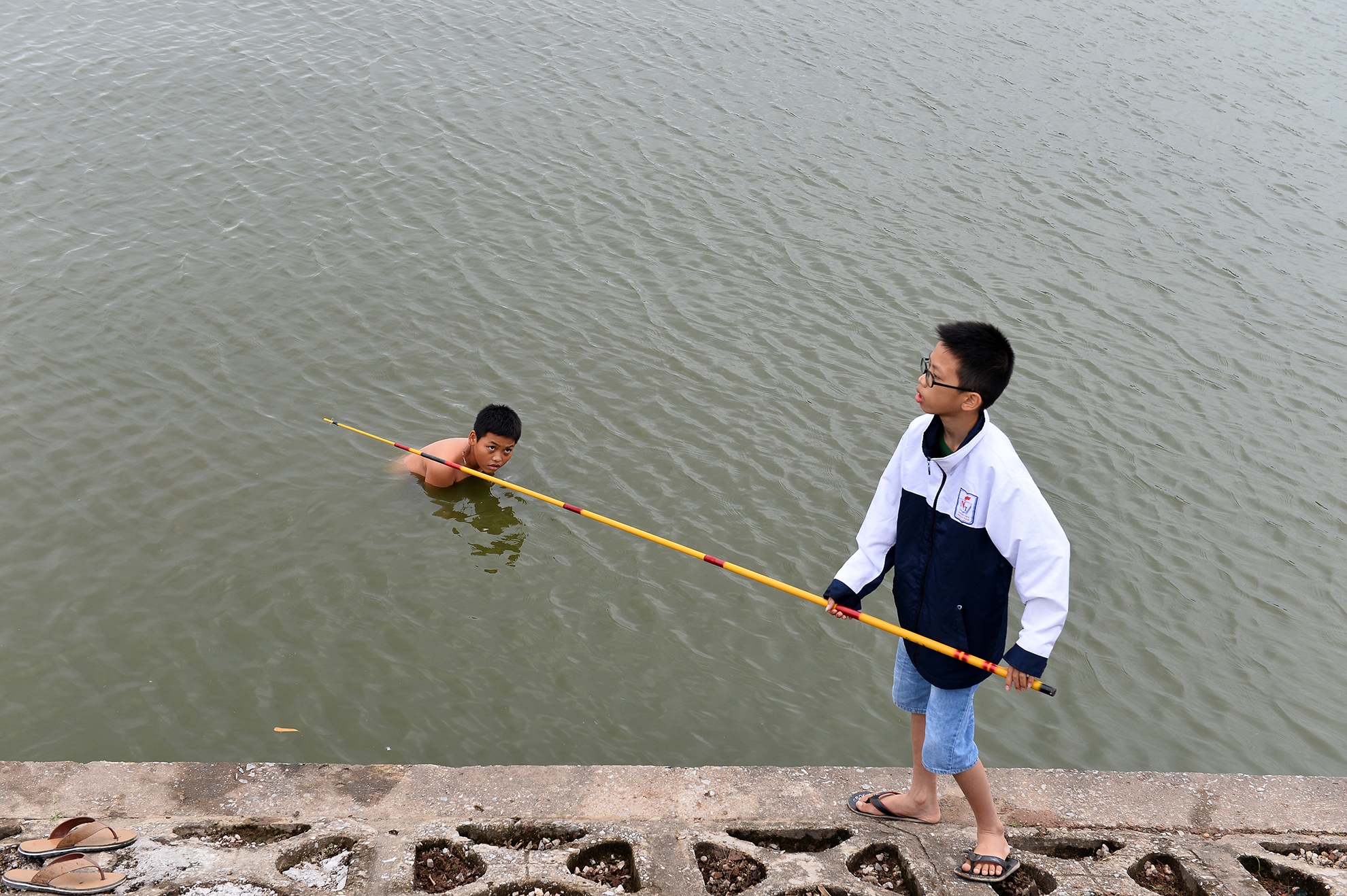 | Mặc dù lạnh nhưng vẫn có một số trẻ em ra hồ Tây câu cá. Khi bị lưỡi câu mắc kẹt dưới đáy, các em cởi áo, xắn quần lội xuống để gỡ, lúc lên bờ cậu bé lạnh run. |