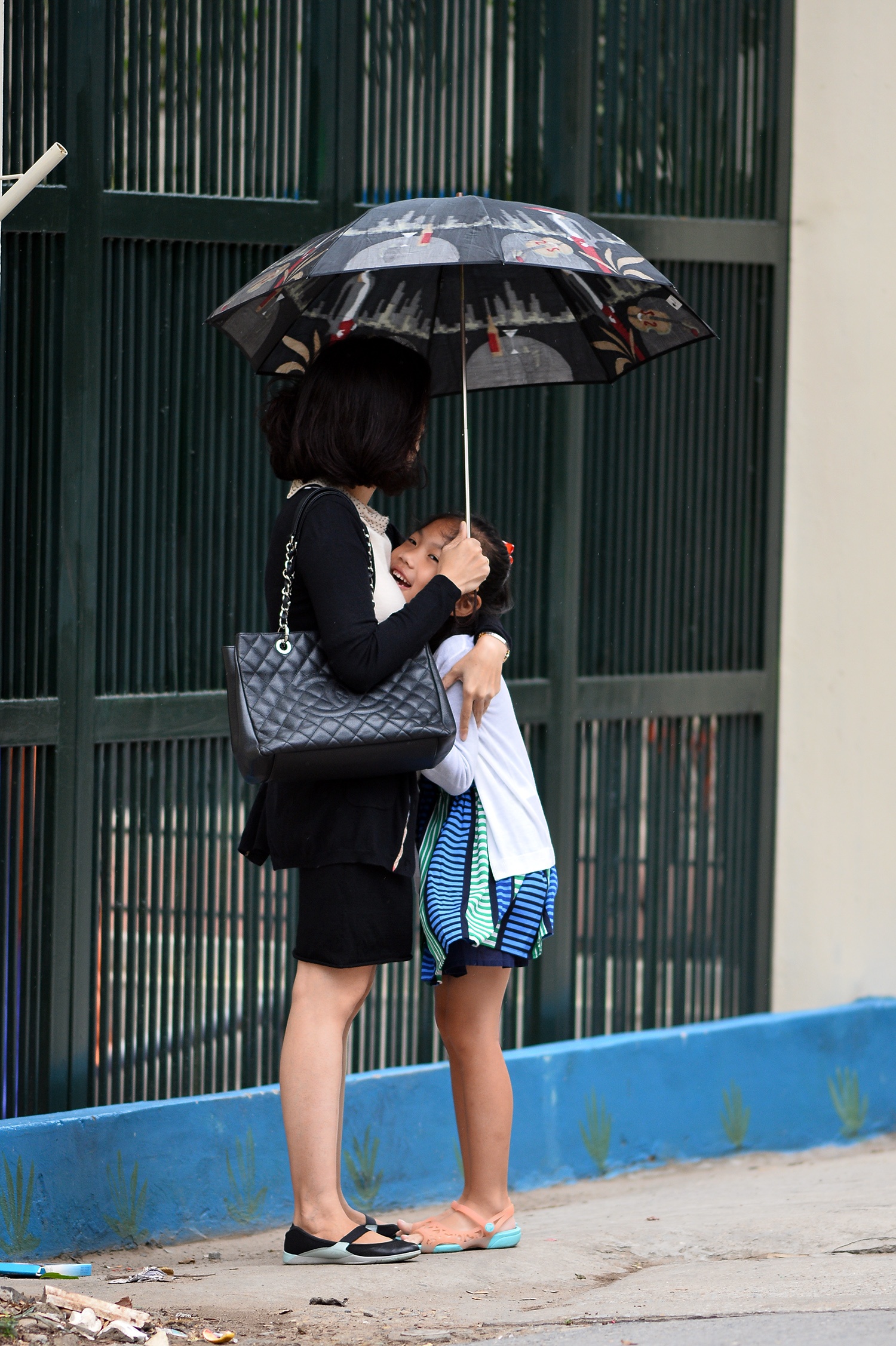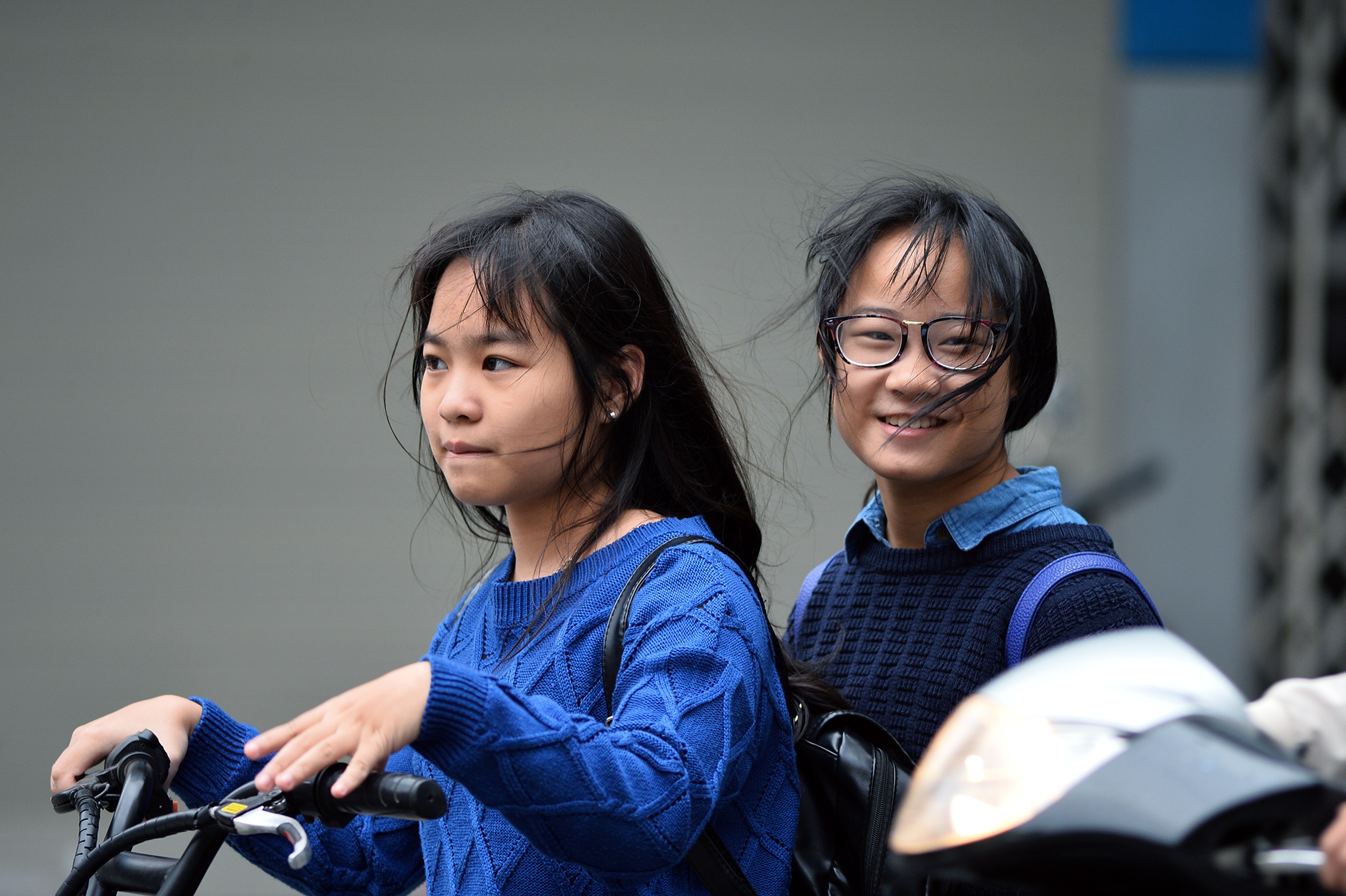 Một em học sinh và người nhà giữ ấm cho nhau trong khi đợi taxi ngoài cổng trường.