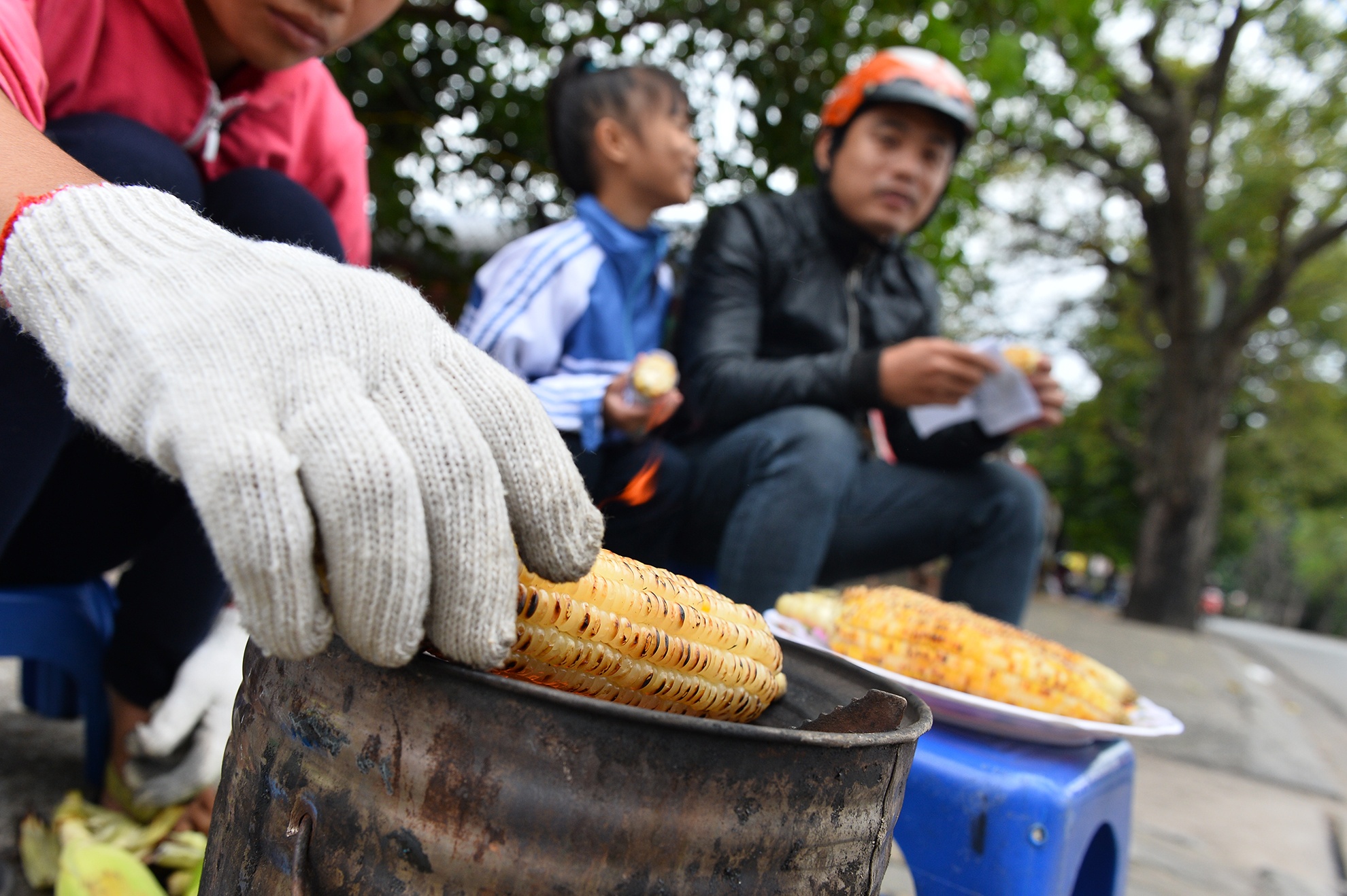 | Một số hàng ngô nướng quanh khu vực Yên Phụ đông khách hơn thường lệ. Giá bán một bắp là 10.000 đồng. |
