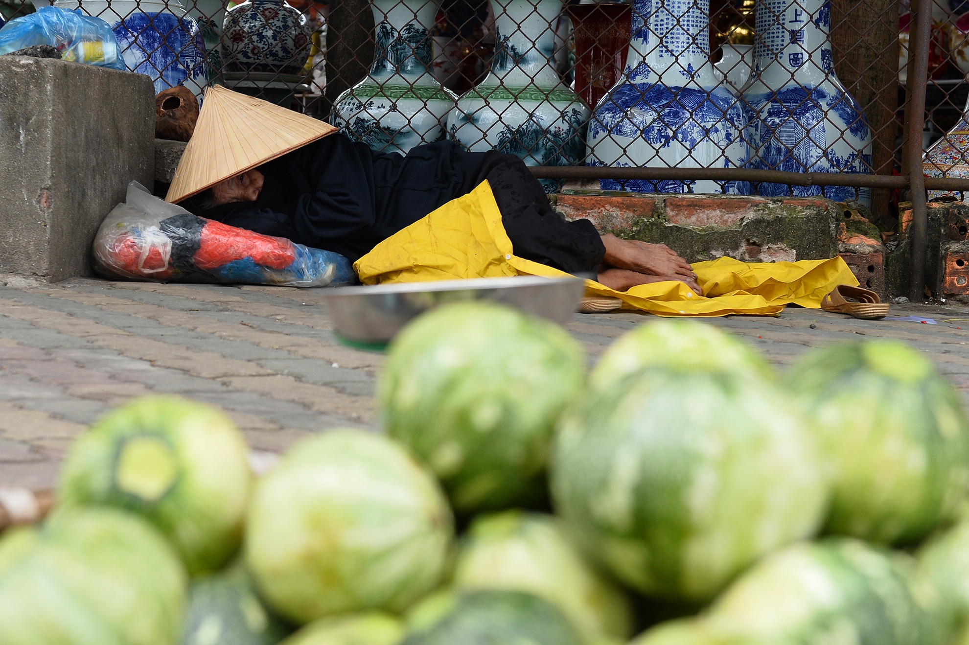 | Bà cụ gần 90 tuổi bán dưa trên vỉa hè nằm co ro ngủ trong lúc ế khách. |
